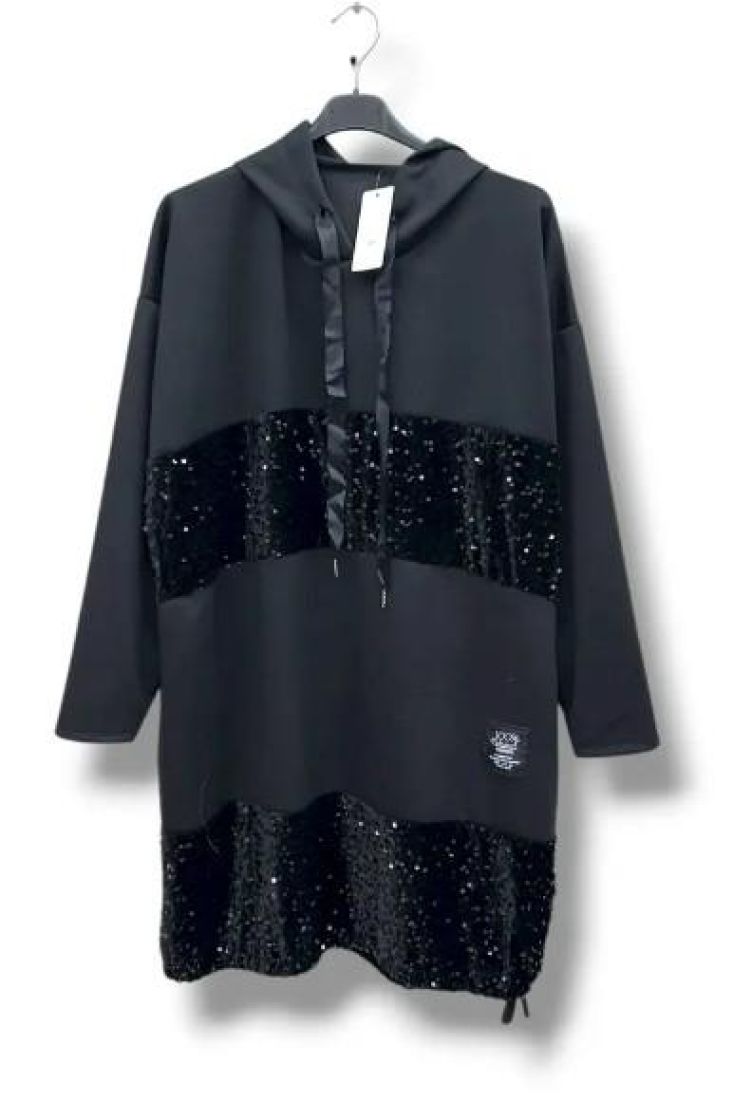 Plusmallistoa New Collection makea collegemekko hupulla. Mekossa kimaltaa kaksi reilua raitaa paljettikoristeista samettia. Helmaa voi kiristää nauhalla ja sivuilta löytyy taskut. Malli on suora ja väljä. Yhden koon malli noin 42-48 kokoisille. Mitoitus on reilu, joten tarkistathan mitat.