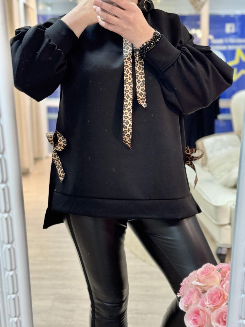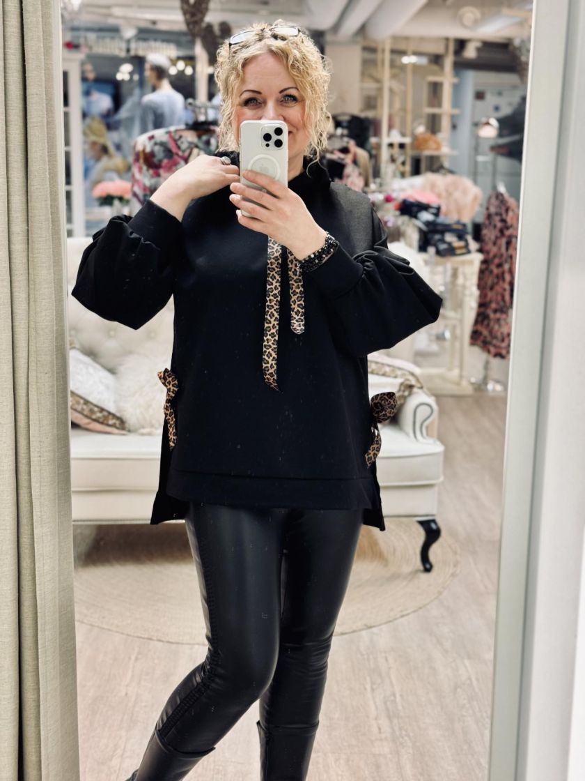 New Collection makea hupparitunika. Hupussa ilmettä antaa leonauhat ja sivuilla leorusetit. Mallissa on laskettu olkapää ja reilu pussihiha. Helma on takaa kivasti pidempi ja sivuja keventää halkiot. Materiaali on ohutta ja pehmeää sekä sisäpuoli kivan liukas. Yhden koon malli noin 38-44 kokoisille.