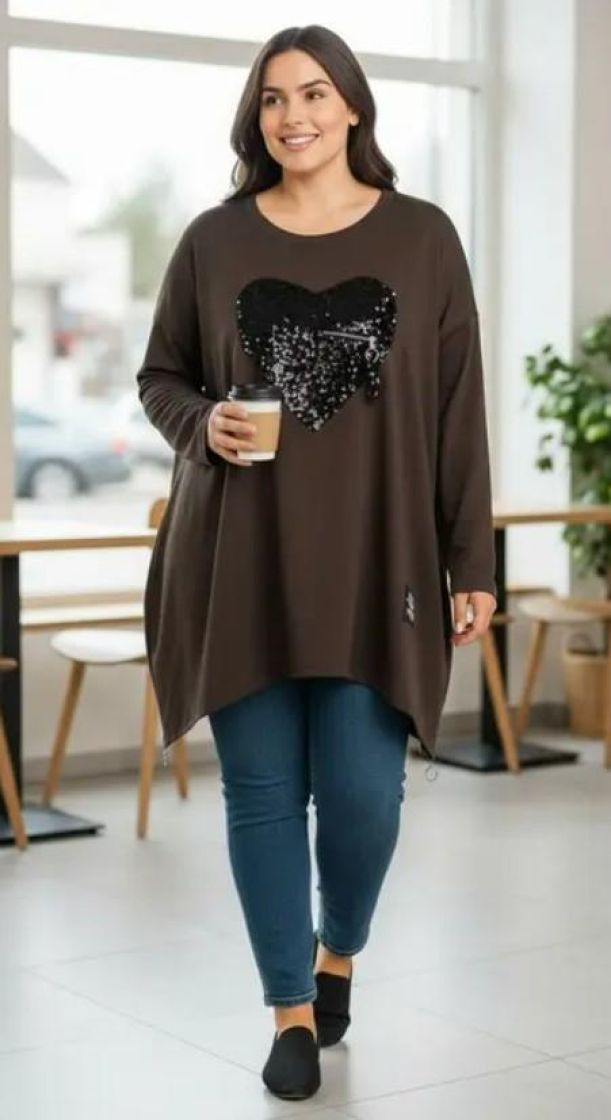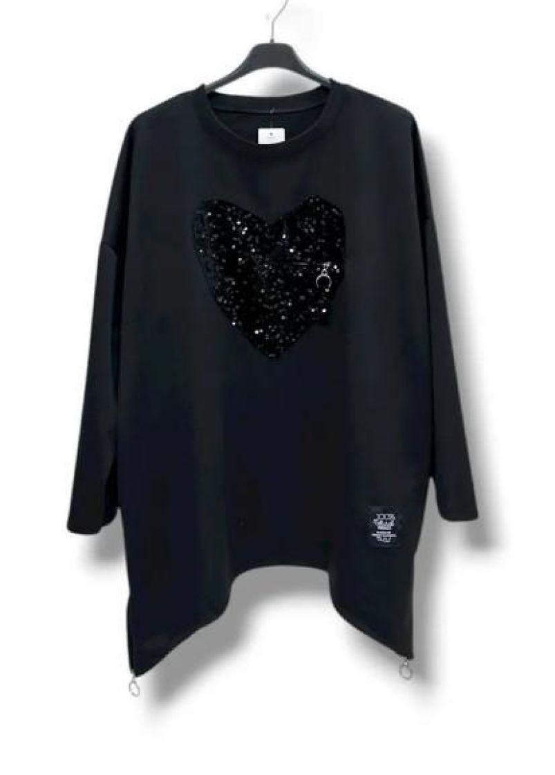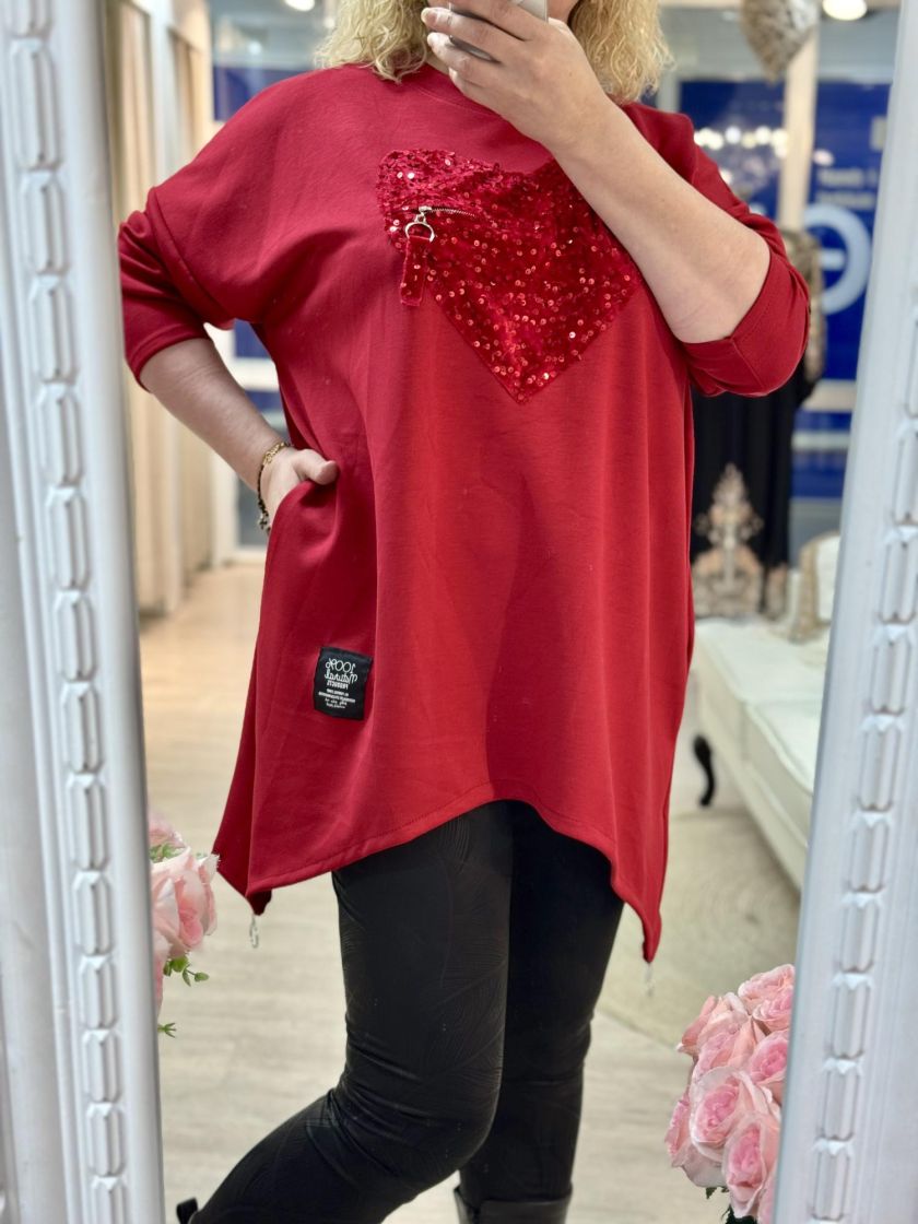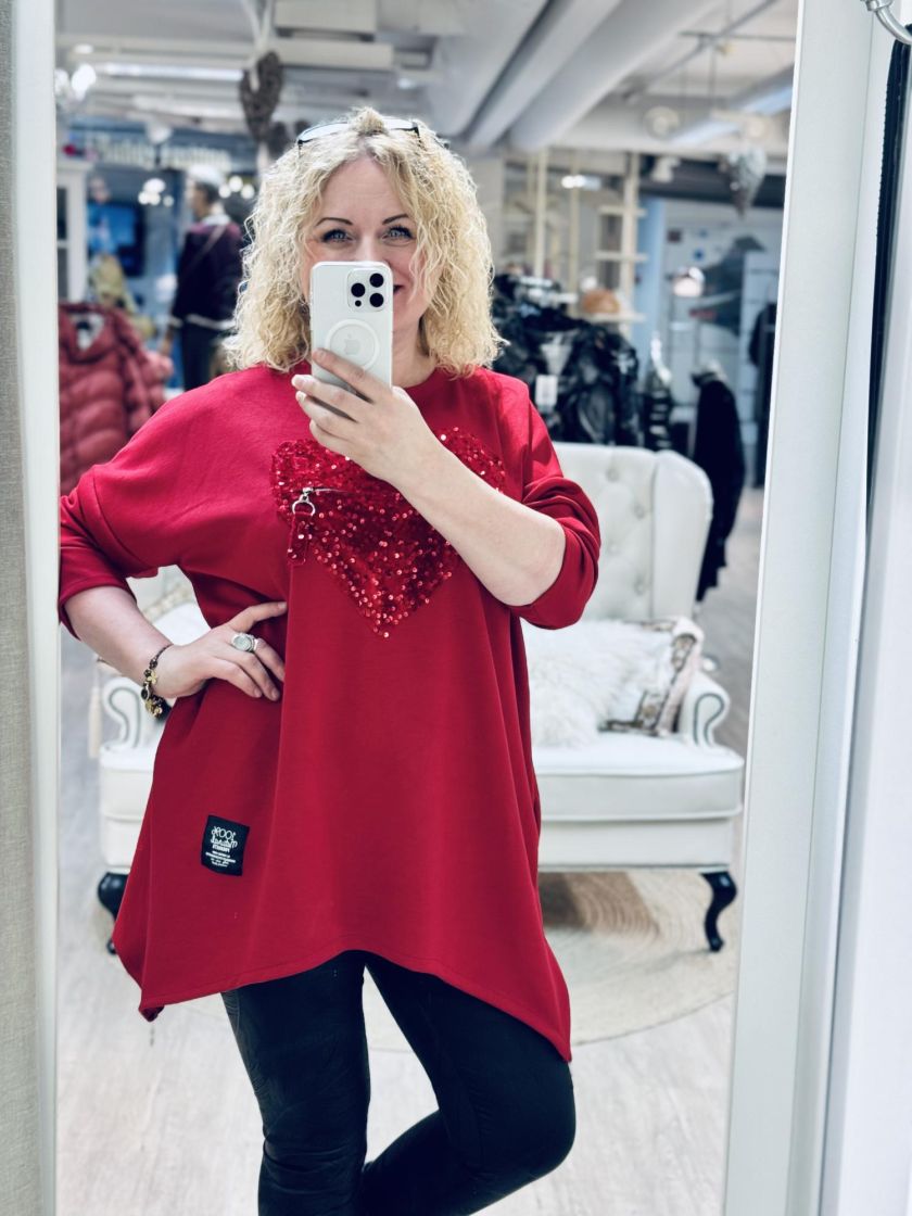 Plusmallistoa New Collection makea collegetunika. Jujuna on edessä vetoketjutaskulla sydän paljettikoristeista samettia. Helma on kivasti kaarrettu sivuilta pidemmäksi ja ilmettä antaa reilut vetoketjut sivuilla. Sivuilta löytyy myös taskut. Yhden koon malli noin 42-48 kokoisille. Mitoitus on reilu, joten tarkistathan mitat.