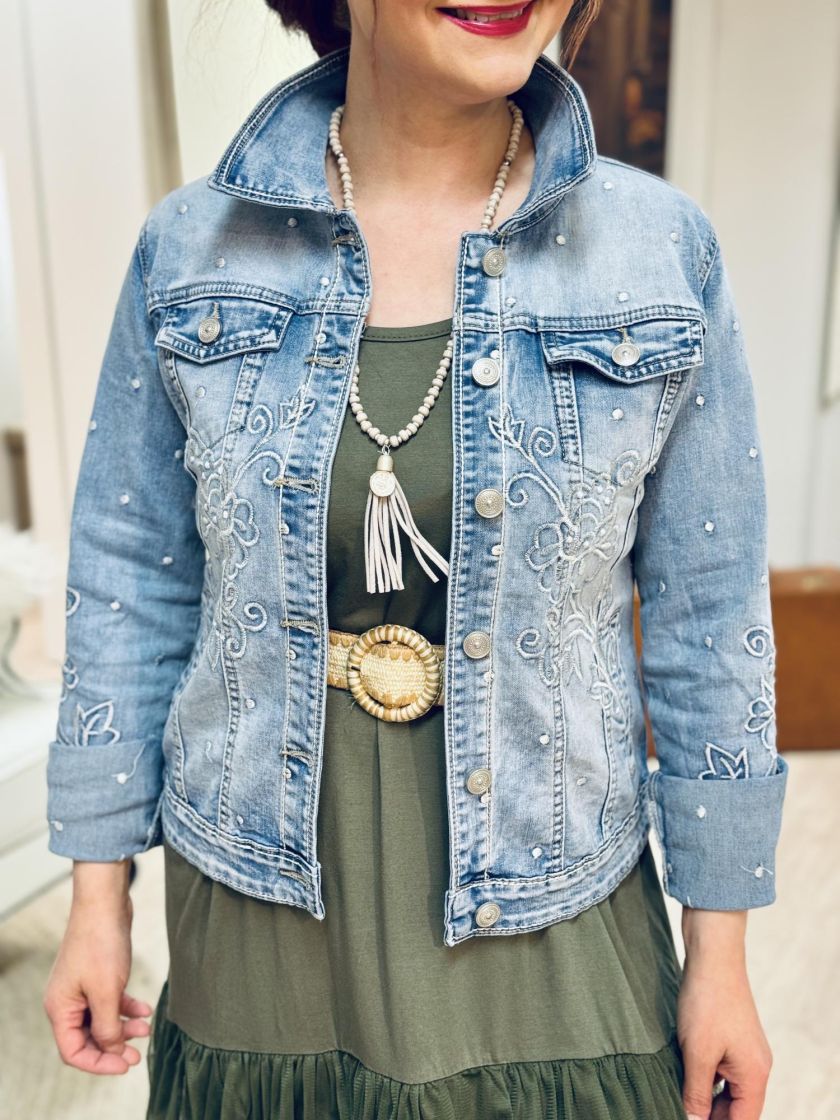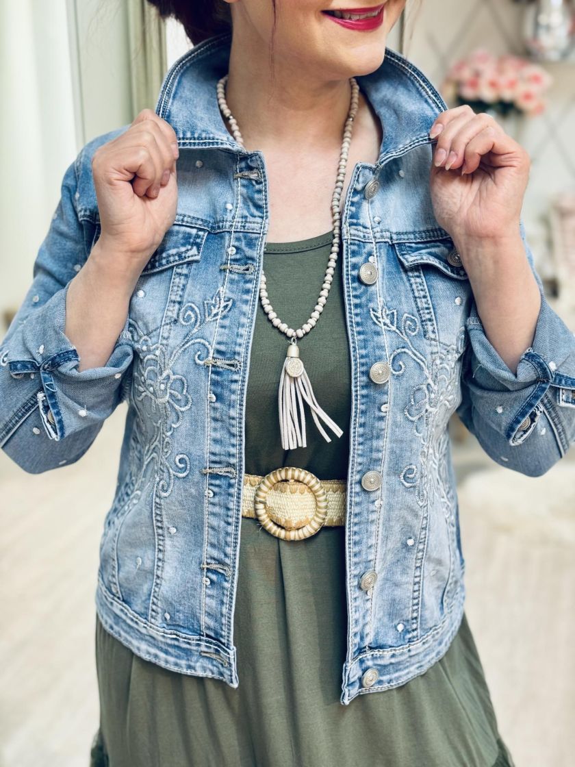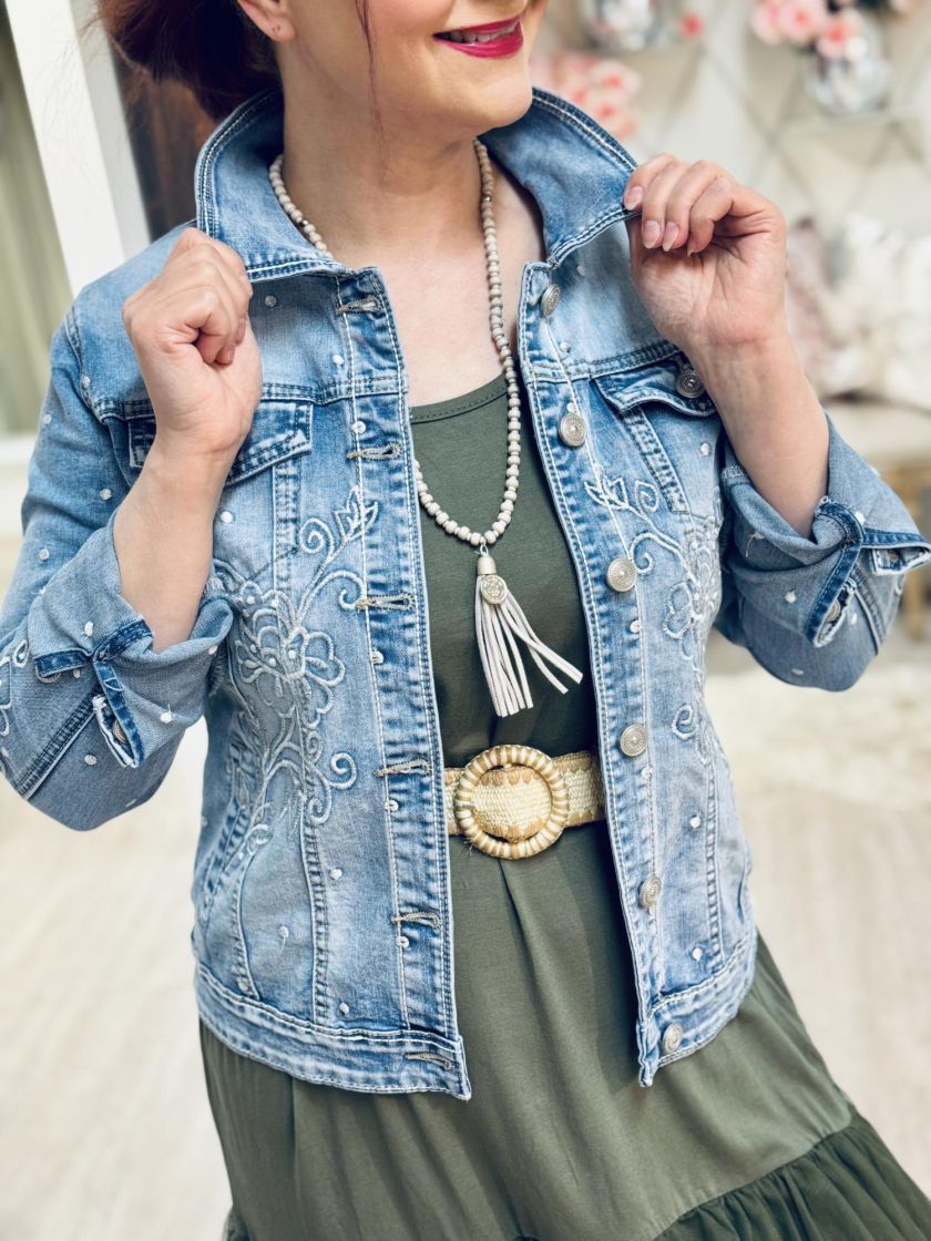 Tämä malli toimii nyt jakkuna ja kevään ja kesän tullen myös takkina. New Collection farkkujakku makeilla hopeisella brodeerauksella. Edessä on napitus, taskut ja läppätaskut. Materiaalina mukava puuvillasekoite. Klassinen malli kauluksella ja aavistuksen pidempi malli.