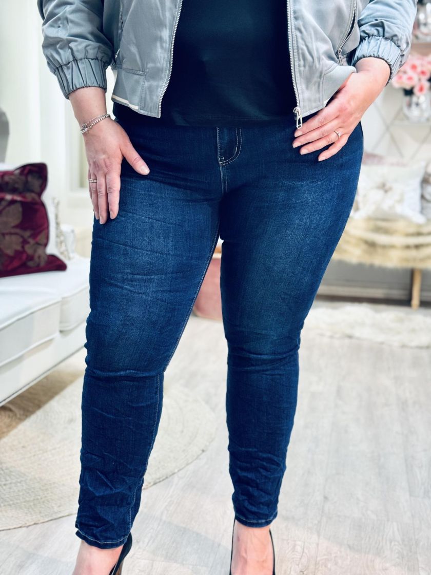 New Collection farkut pehmeää joustopuuvillaa. Tämä malli on oikein perusfarkku kivalla, hieman kulutetulla tummalla pesulla. Vyötärö on korkea, lahje kapeneva ja lahjetta kääntämällä voi säädellä pituutta. Koon voi ottaa yhden koon normaalikokoa pienempänä, mutta farkun voi ottaa myös väljempänä. Tarkastathan mitat!