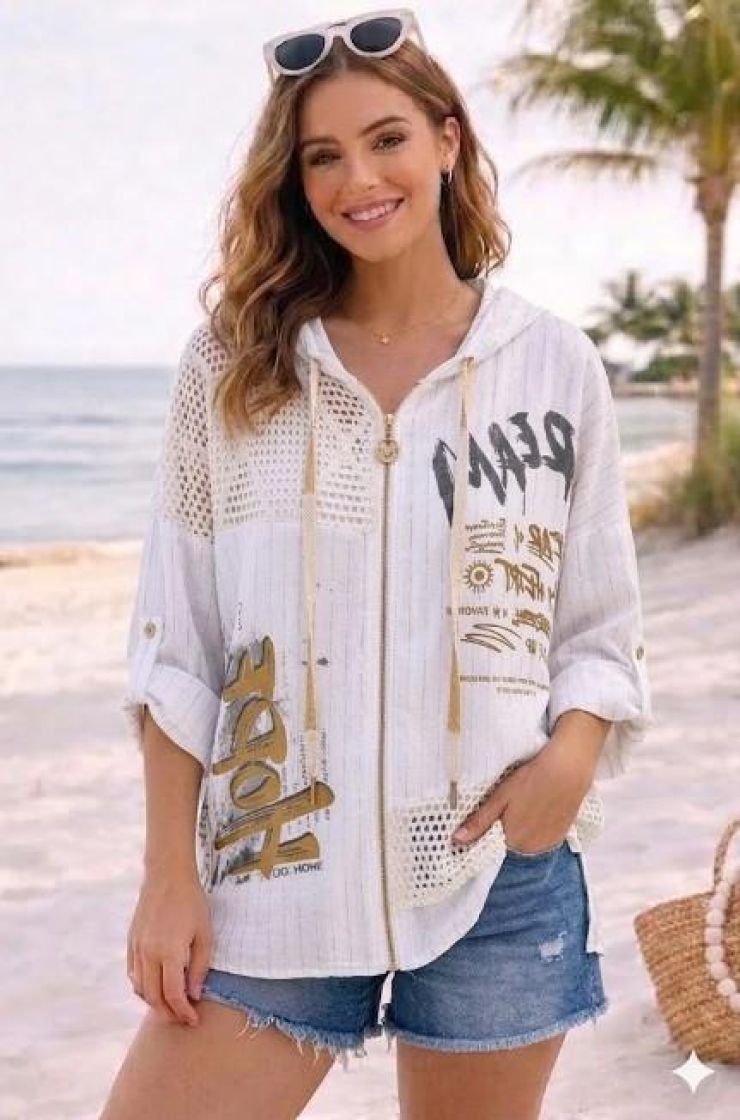 New Collection makee huppari-jakku mukavan ohutta ja kevyttä viskoosi-puuvillaa. Edessä kultatekstiä, läpinäkyvää verkkokangasta ja kimallelankaa. Helma on takaa hieman pidempi ja huppua voi kiristää nauhoilla. Yhden koon malli noin 38-42.Tarkistathan mitat.