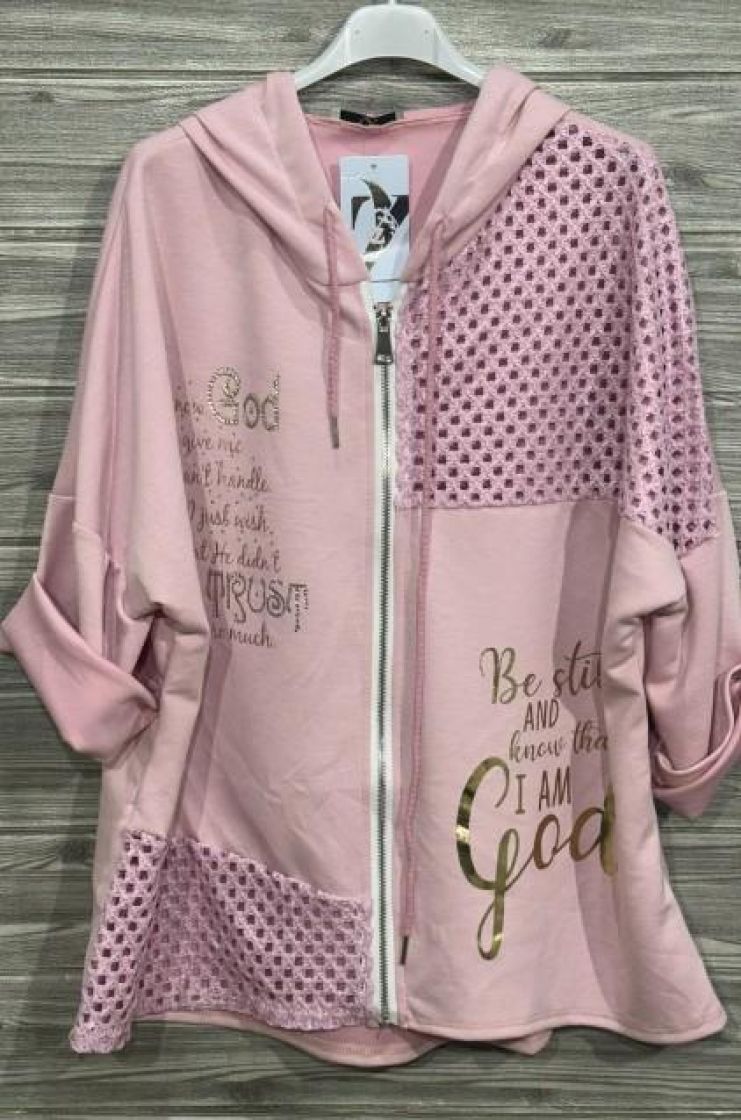 New Collection makee huppari-jakku mukavan ohutta ja kevyttä viskoosi-puuvillaa. Edessä kultatekstit starsseilla ja läpinäkyvää verkkokangasta. Helma on takaa hieman pidempi ja huppua voi kiristää nauhoilla. Yhden koon malli noin 38-44.Tarkistathan mitat.
