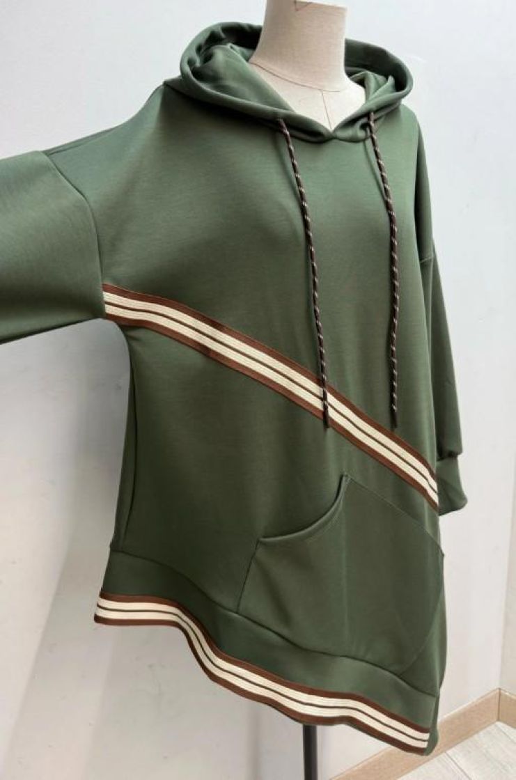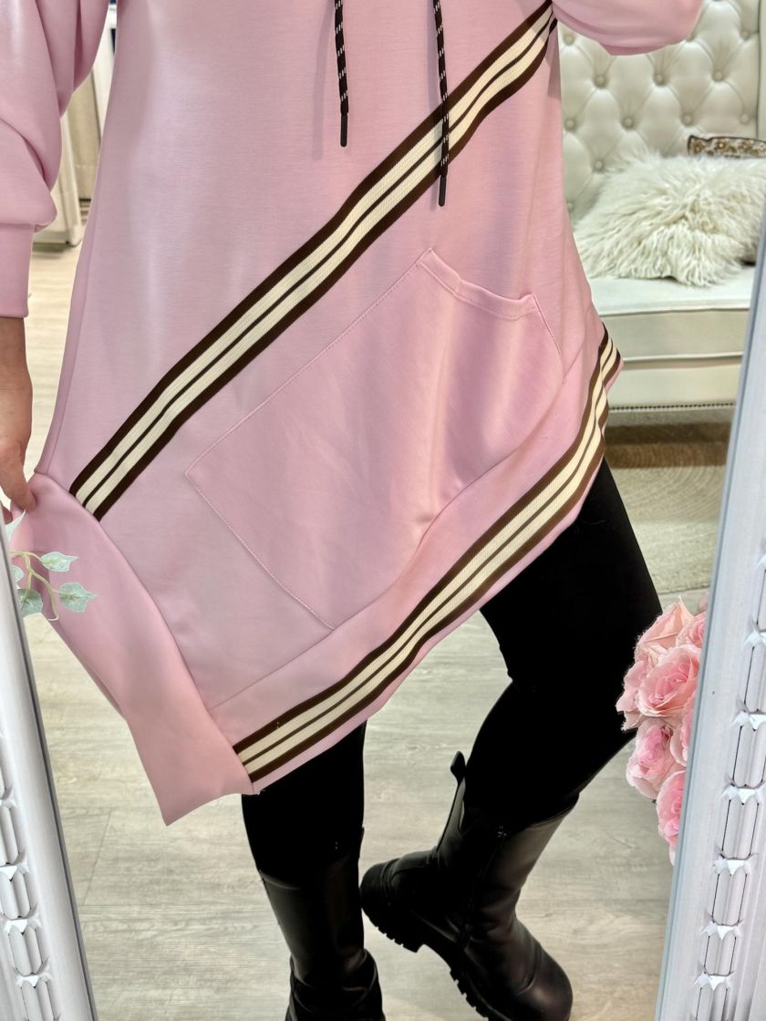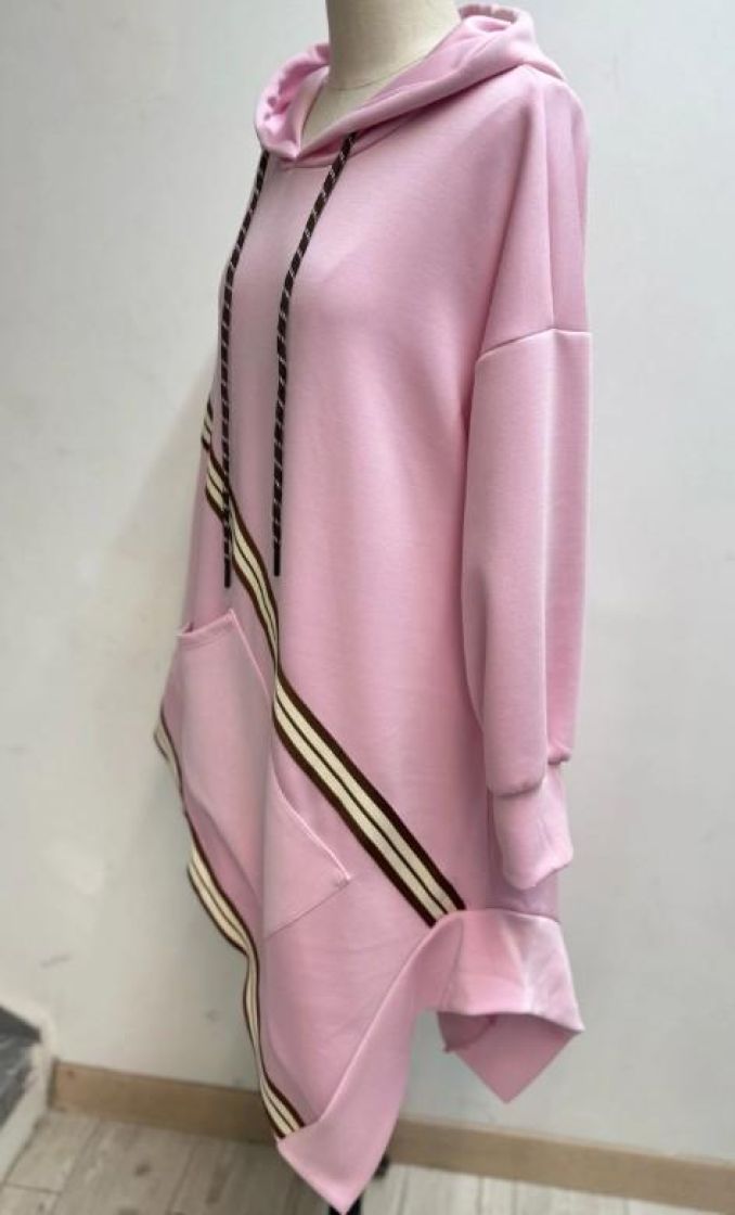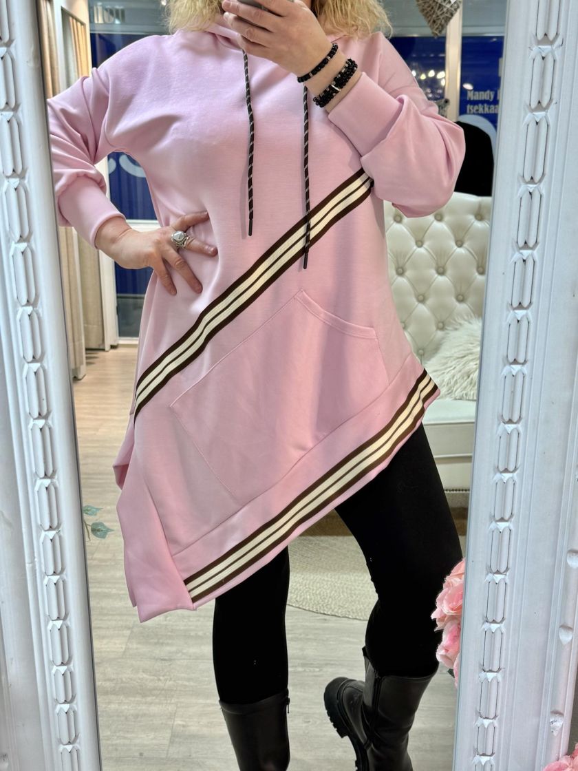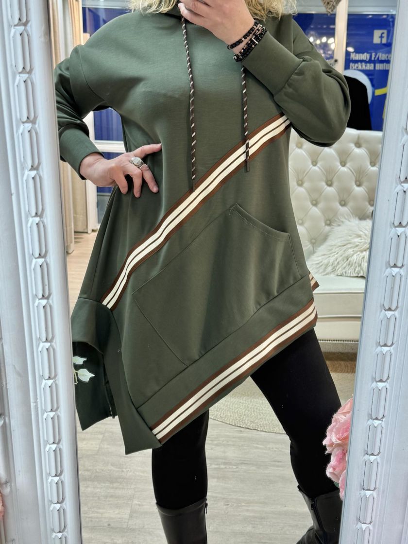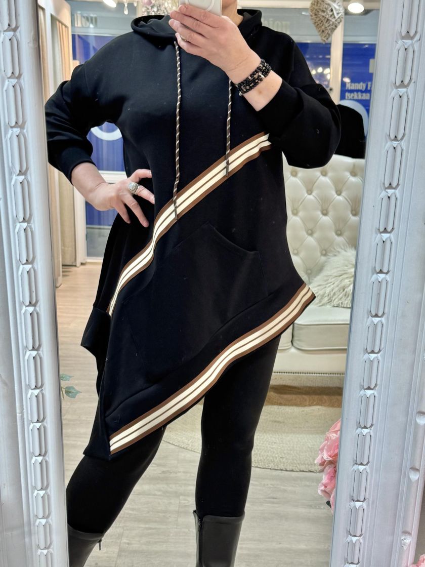 New Collection makea hupputunika. Tunikassa ilmettä antaa raitanauhat ja edessä vinottain tasku. Mallissa on laskettu olkapää ja reilu hiha, sekä hupussa raitakiristysnauhat. Helma on toiselta sivulta reilusti pidempi ja helma hieman levenevä. Materiaali on ohutta ja pehmeää sekä sisäpuoli kivan liukas. Yhden koon malli noin 38-44 kokoisille.