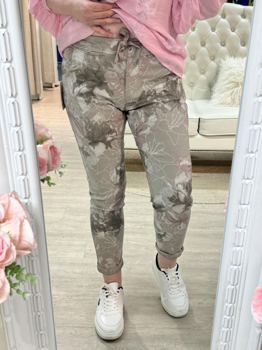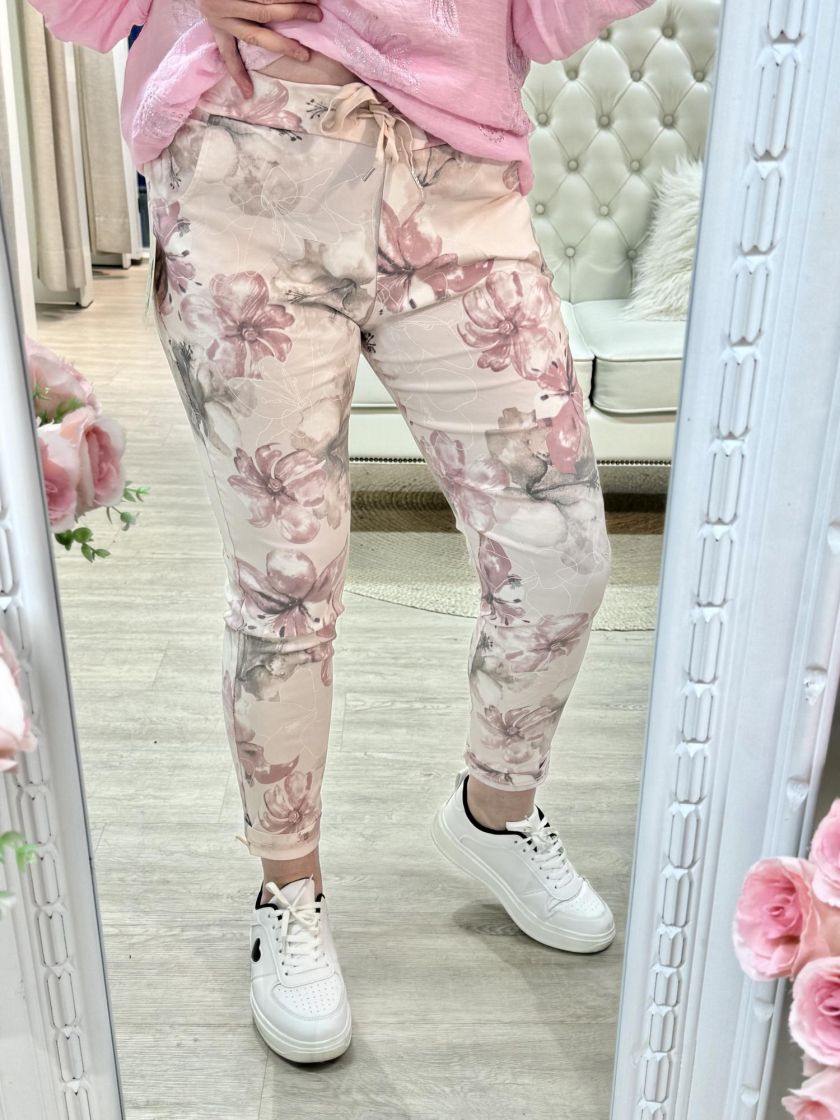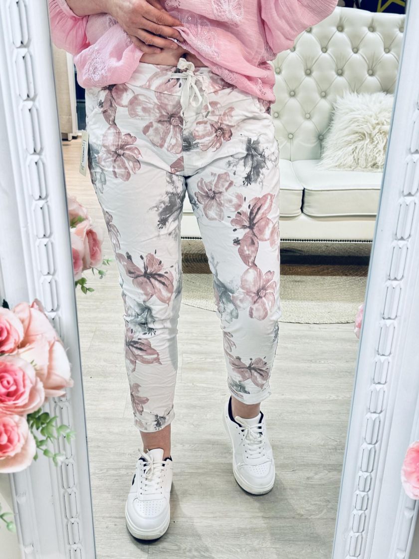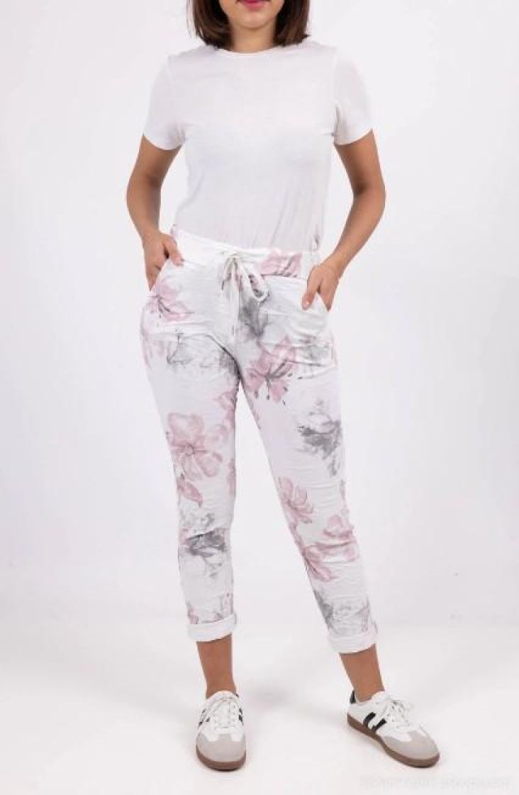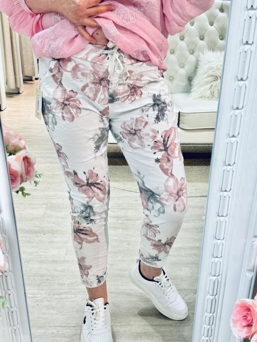 New Collection kivat kukkajoggerit. Mukavuuden takaa joustava kuminauhavyötärö kiristysnauhoilla ja lahkeen pituutta voi säätää kääntämällä. Edestä löytyy taskut. Materiaali on kivan ohut ja todella joustava puuvillacollege. Yhden koon malli noin 36-42 kokoisille.