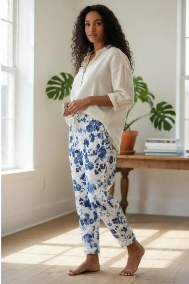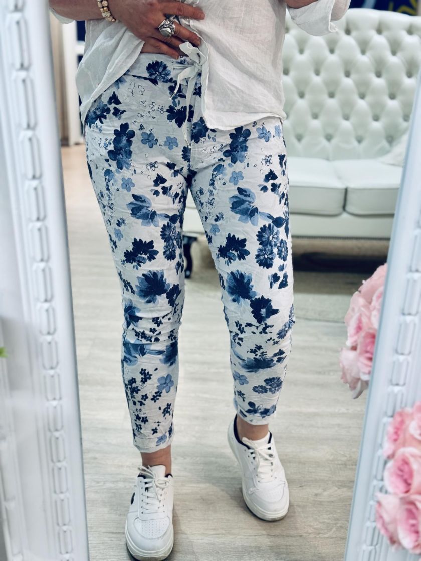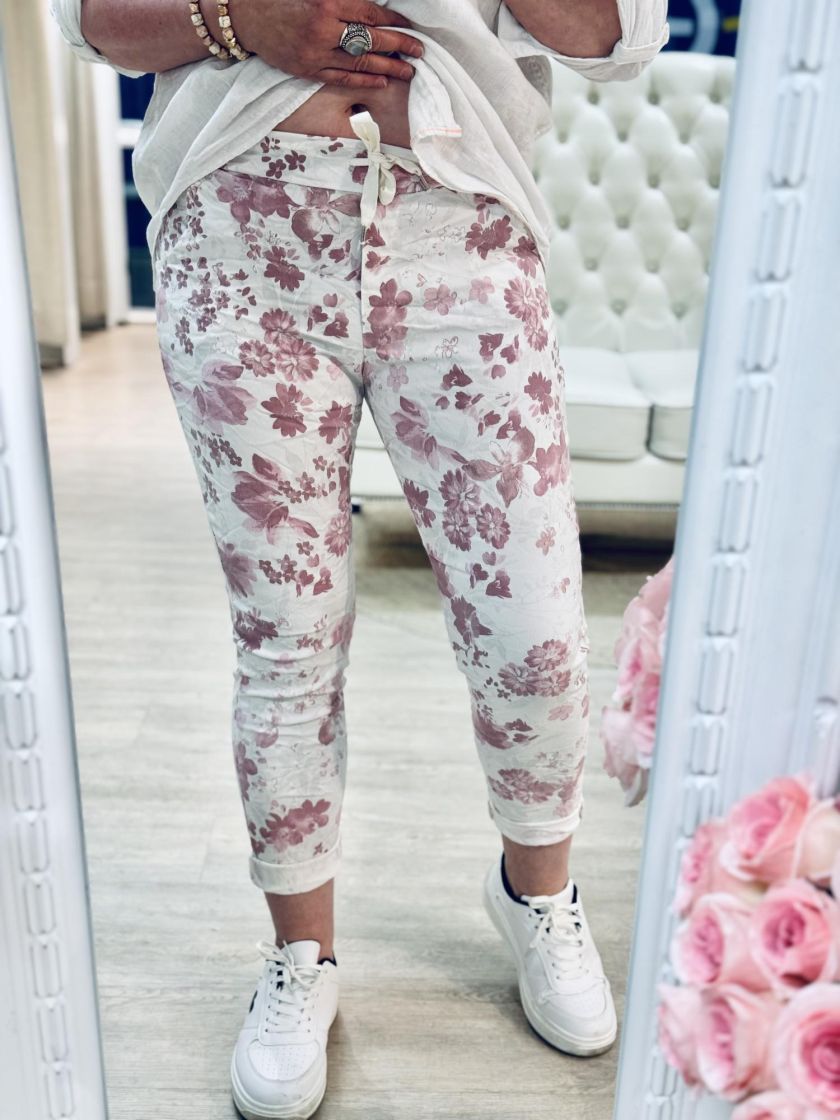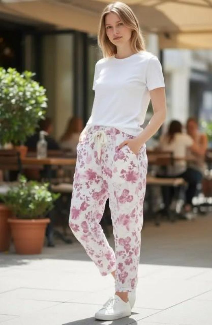 New Collection kivat kukkajoggerit. Mukavuuden takaa joustava kuminauhavyötärö kiristysnauhoilla ja lahkeen pituutta voi säätää kääntämällä. Edestä löytyy taskut. Materiaali on kivan ohut ja joustavaa viskoosisekoitetta. Tarkastathan mitat.