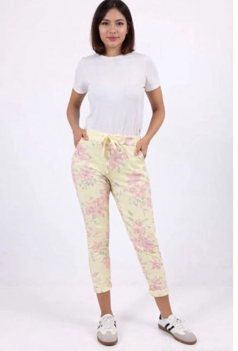 New Collection kivat kukkajoggerit. Mukavuuden takaa joustava kuminauhavyötärö kiristysnauhoilla ja lahkeen pituutta voi säätää kääntämällä. Edestä löytyy taskut. Materiaali on kivan ohut ja joustavaa puuvillaa. Yhden koon malli noin 38-42 kokoisille. Tarkastathan mitat.