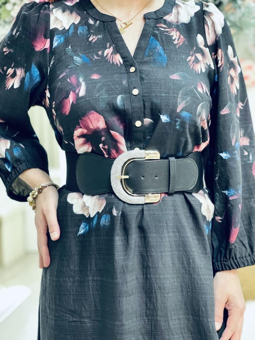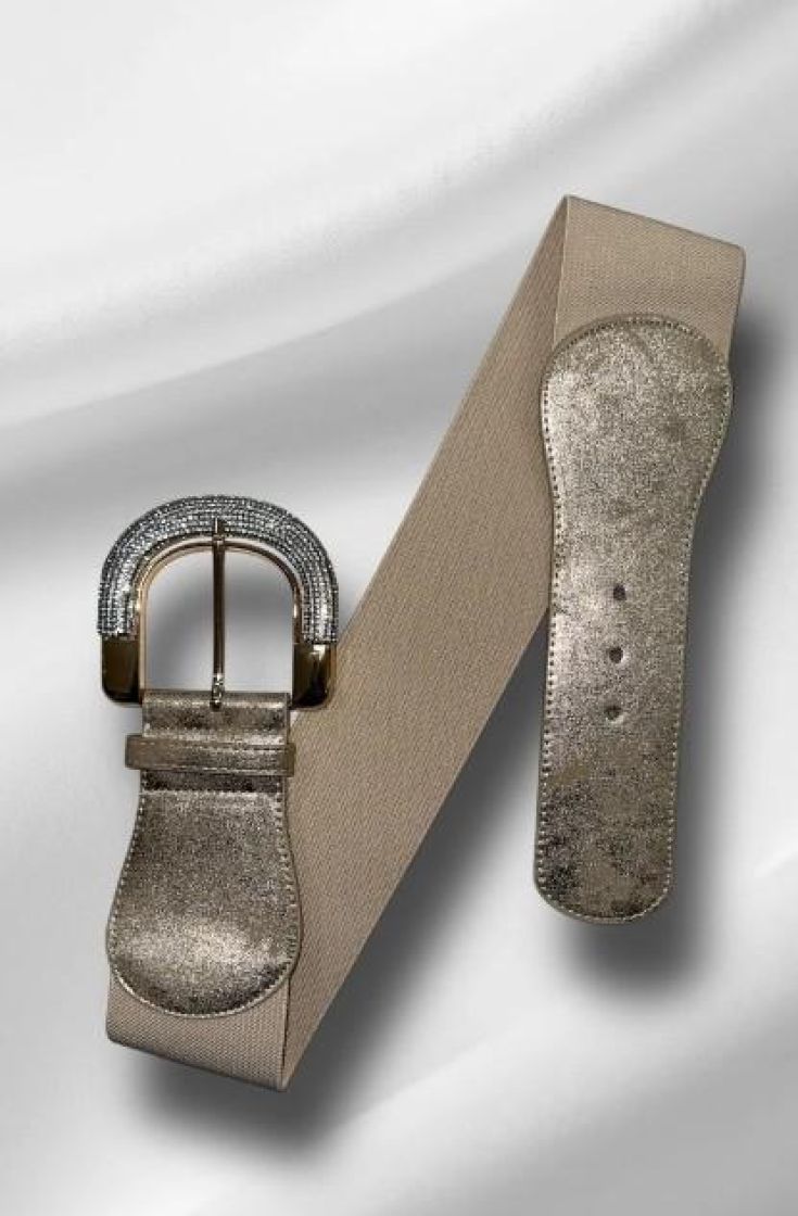 New Collection leveä joustovyö. Vyössä on näyttävä kullankimaltava strassisolki ja väreinä musta-kulta sekä beige-kulta. Vyö sopii noin 34-40 kokoisille.