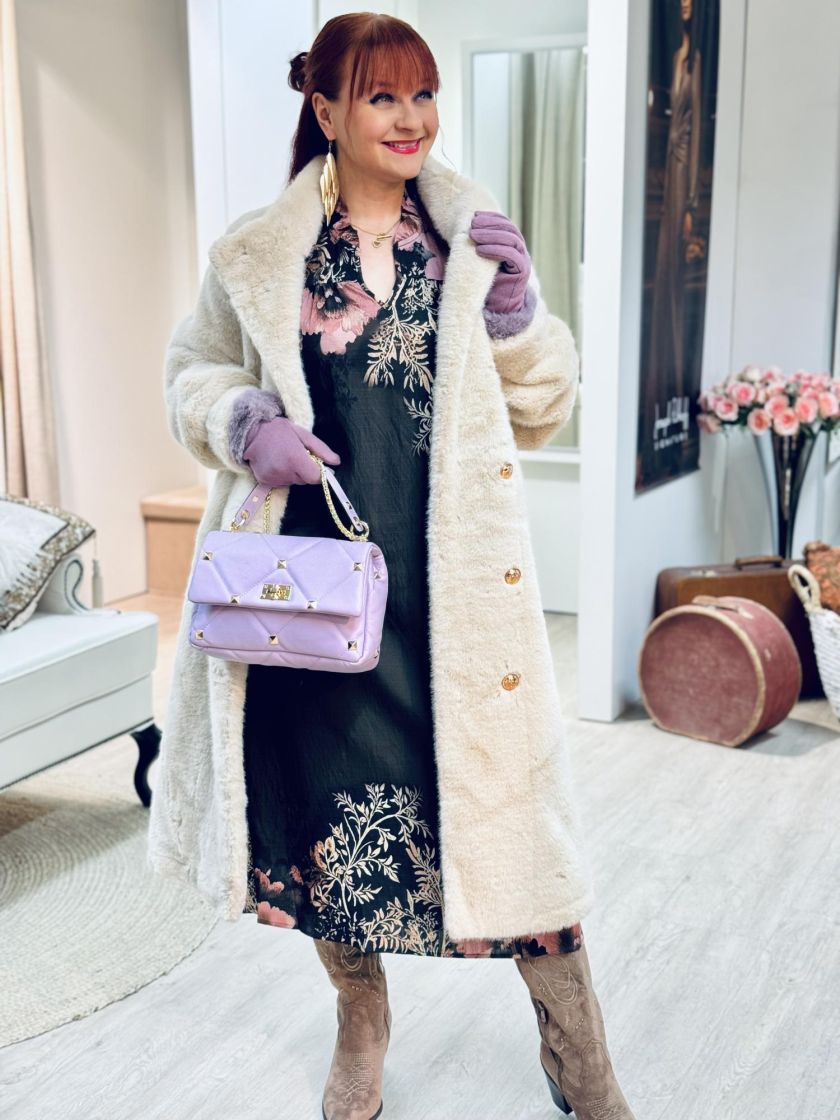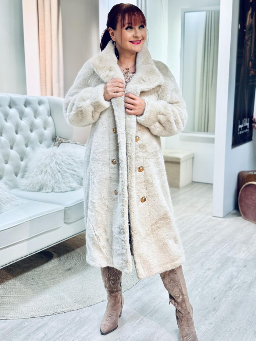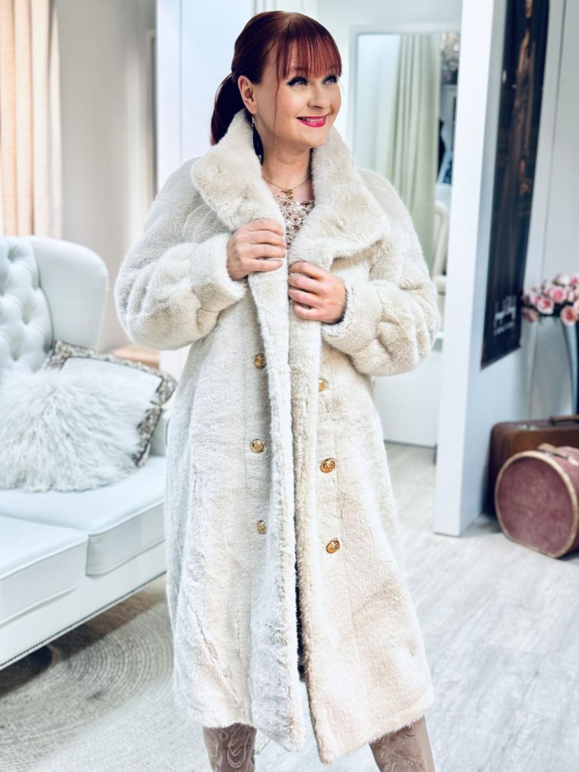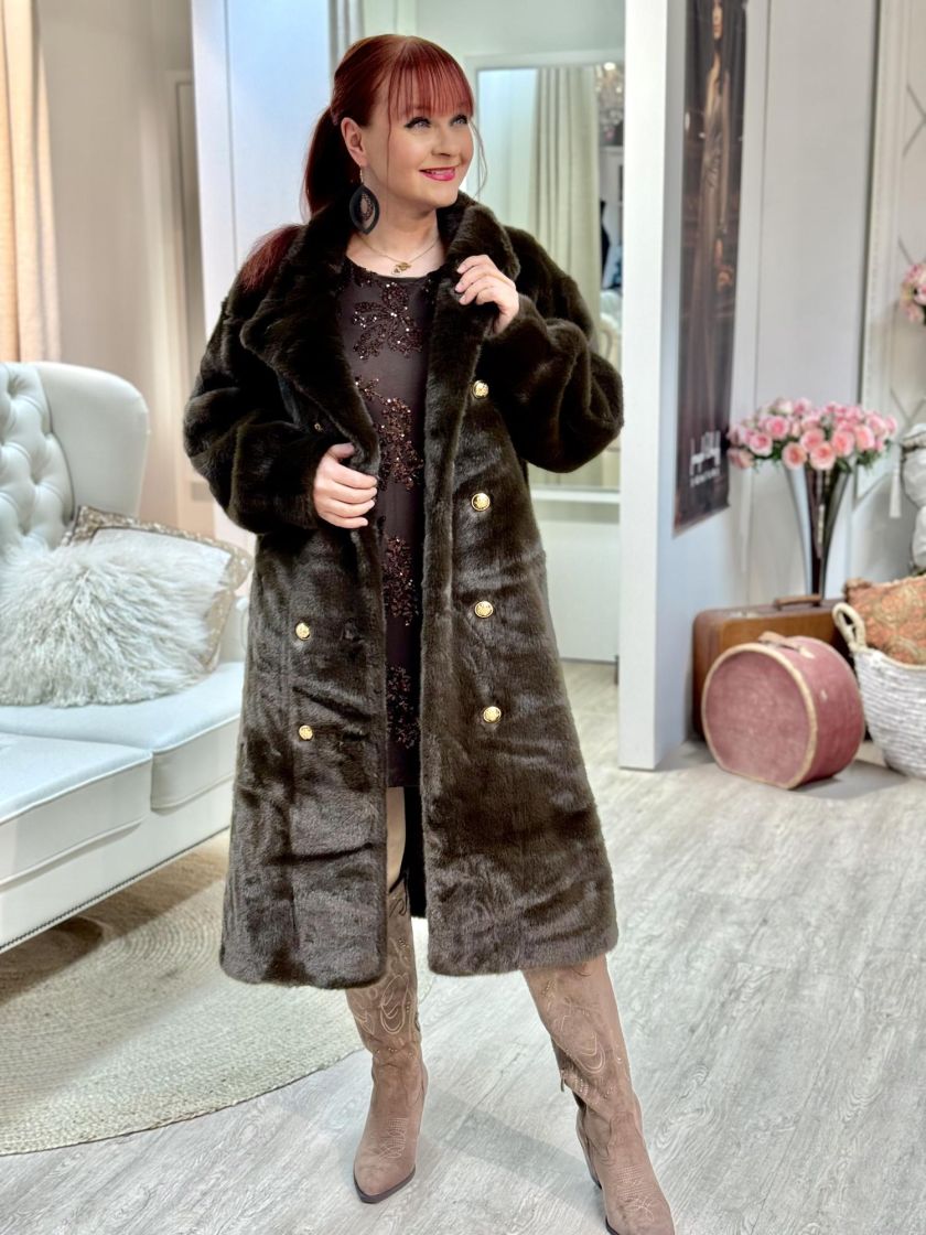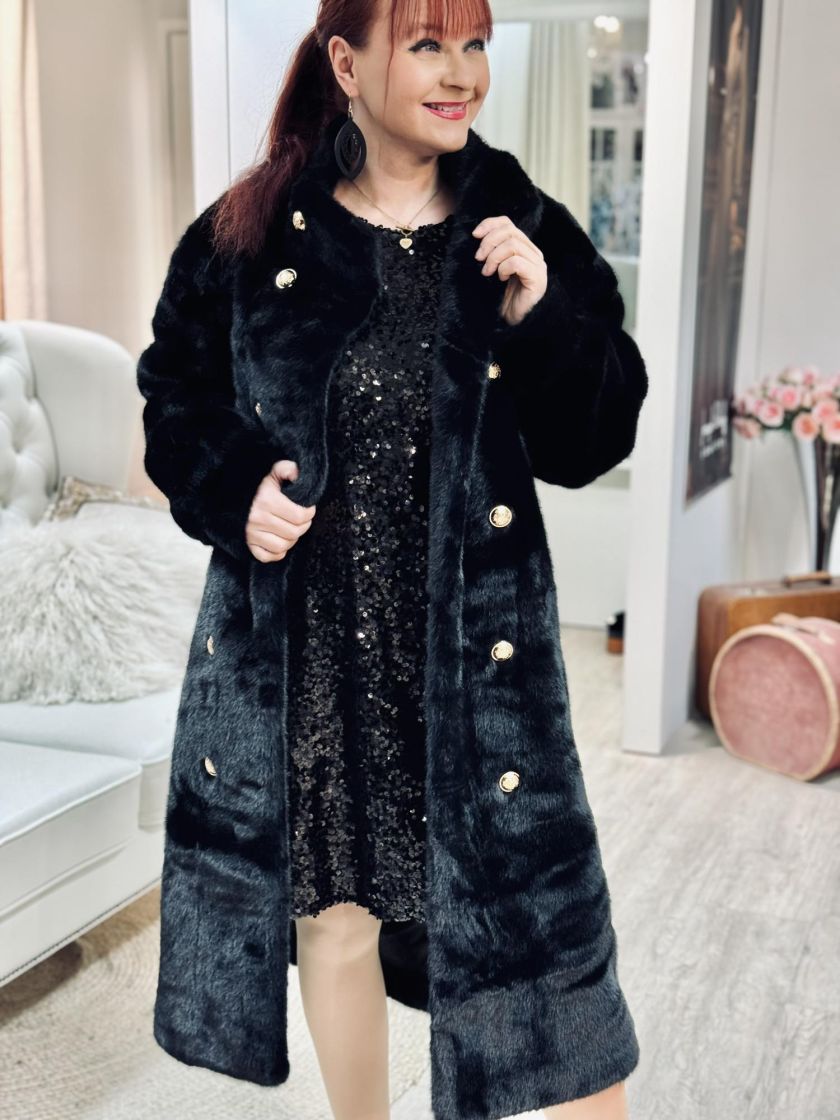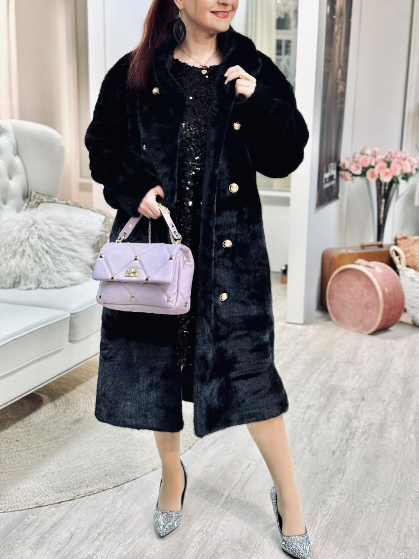 New Collection ihanan pörröinen ja pehmeä keinokarvatakki. Takin kiinnitys on näyttävillä kullanvärisillä napeilla. Kaulus on kauniisti nouseva ja sen voi myös kääntää. Hihansuussa ryhtiä antaa kaitale ja edestä löytyy taskut. Takissa ei ole vuorta. Malli on suora ja mitoitus siro, tarkistathan mitat.