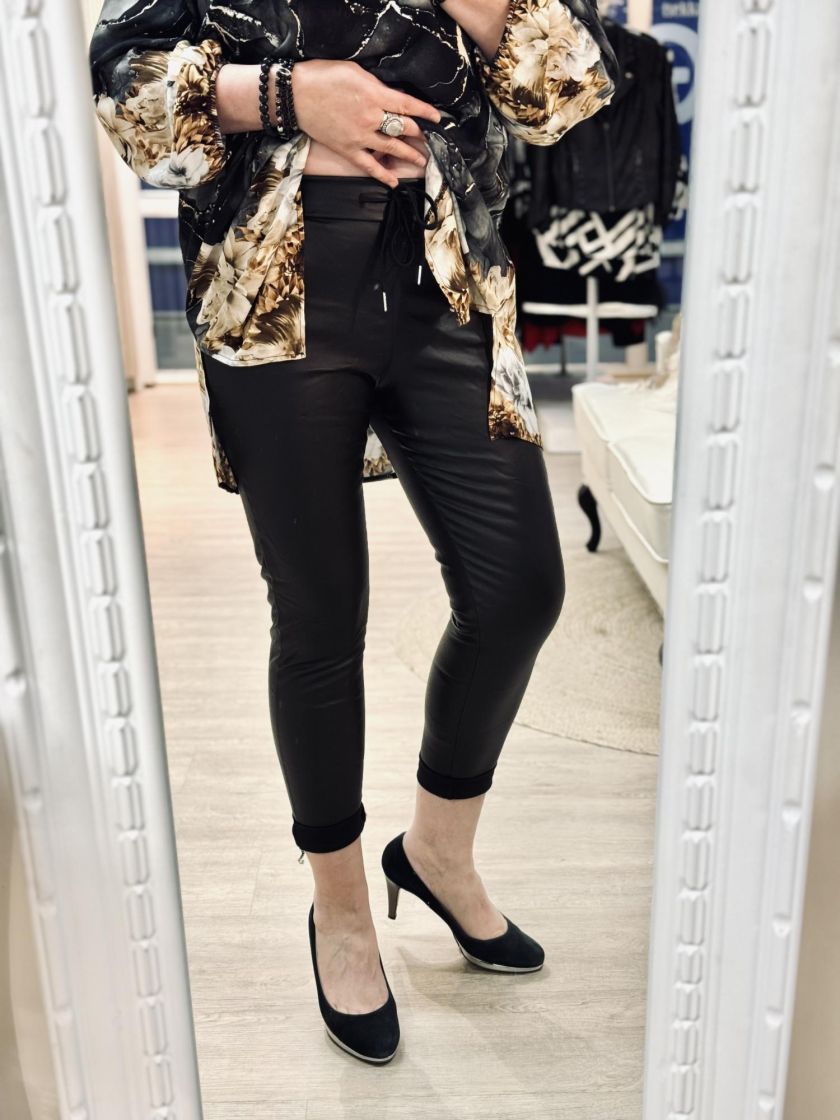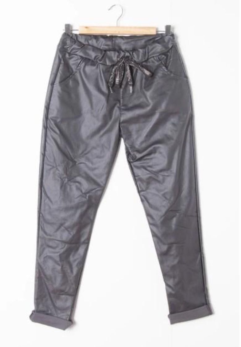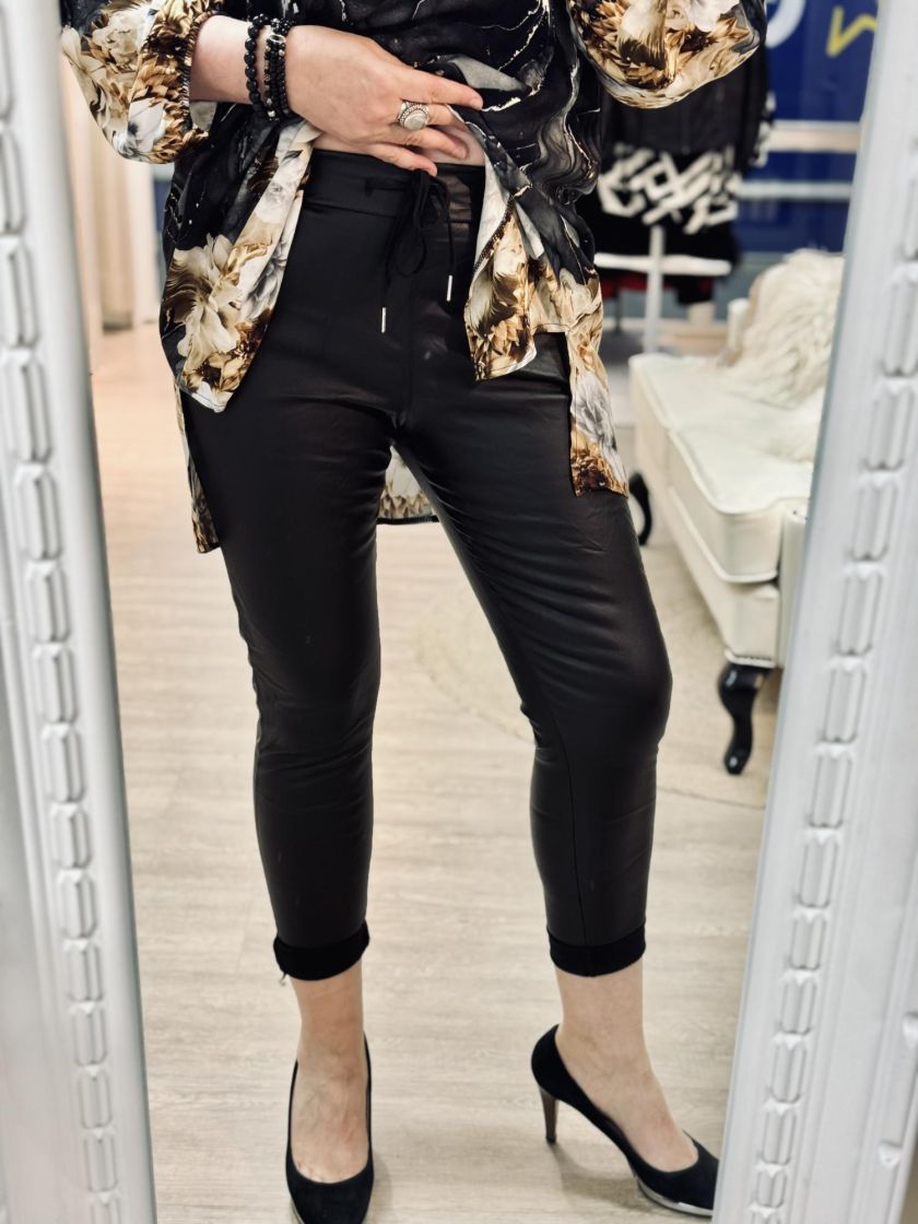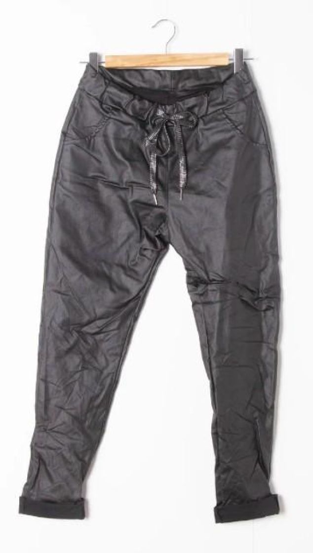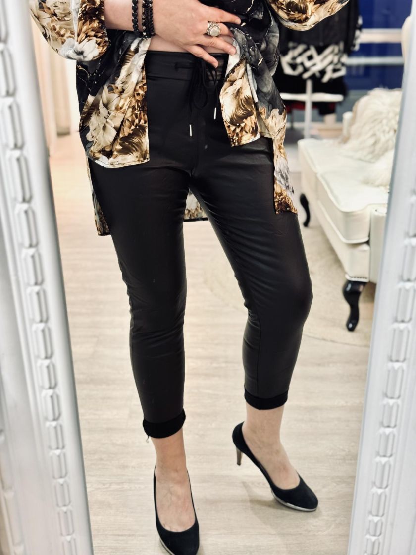New Collection joggerit liukasta ja kivan siftaavaa nakhajäljitelmää. Joggerissa on joustovyötärö ilman vetoketjua ja vyötäröllä kiristysnauhat. Edestä löytyy taskut. Vyötärönkorkeus on normaali ja lahjetta kääntämällä voi säädellä pituutta. Mitoitus on siro, joten tarkistathan mitat. Yhden koon malli noin 36-40 kokoisille.