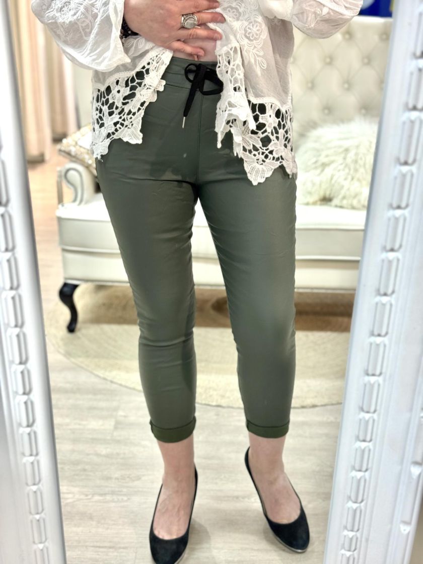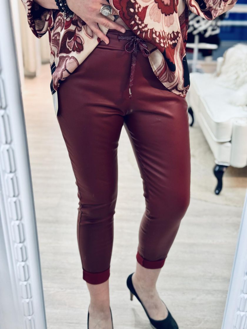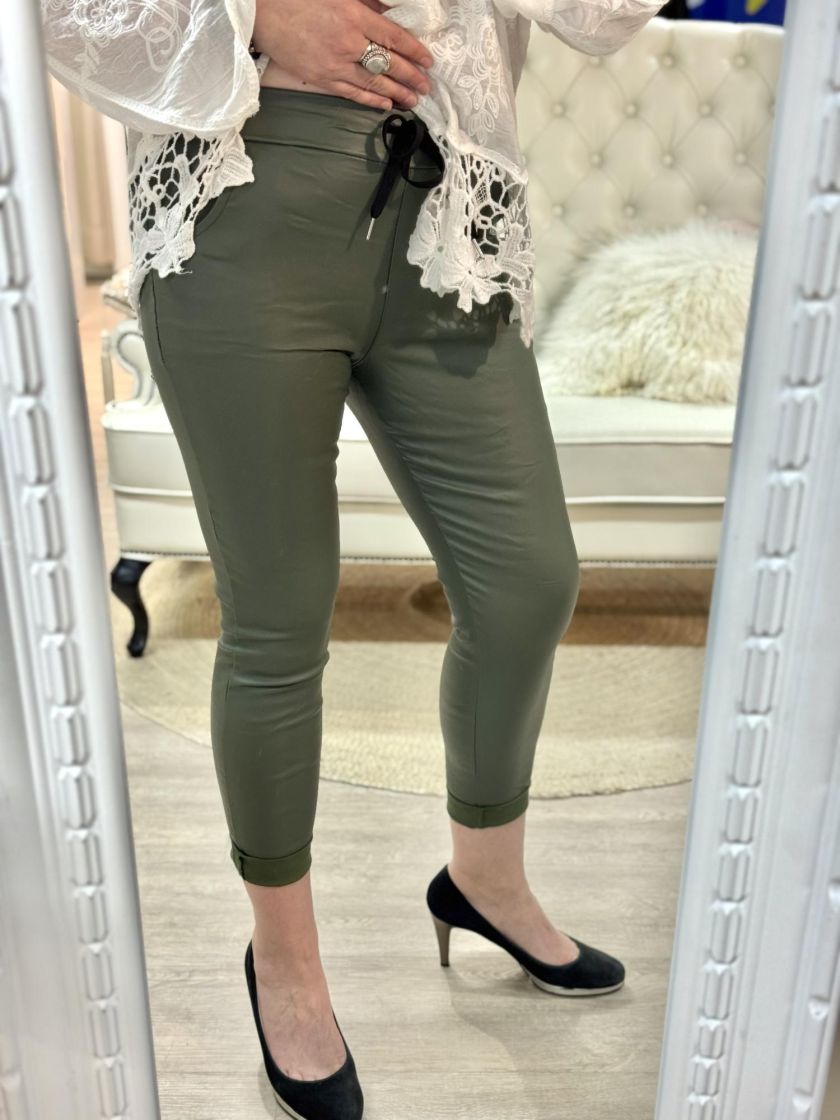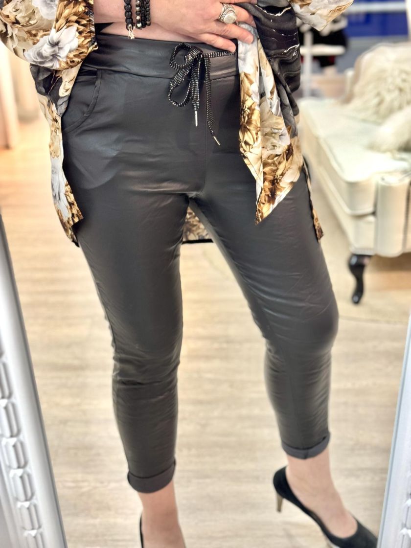 New Collection joggerit liukasta ja kivan siftaavaa nakhajäljitelmää. Joggerissa on joustovyötärö ilman vetoketjua ja vyötäröllä kiristysnauhat. Edestä löytyy taskut. Vyötärönkorkeus on normaali ja lahjetta kääntämällä voi säädellä pituutta. Mitoitus on siro, joten tarkistathan mitat. Yhden koon malli noin 36-40 kokoisille.