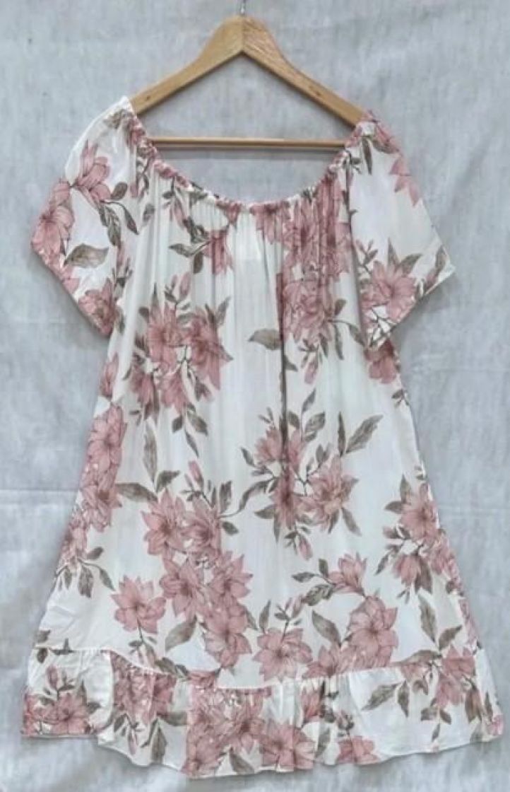 New Collection kevyt ja kesäinen mekko suurikokoisilla kukilla. Mekon ilmava malli laskeutuu kauniisti. Pääntiellä on rypytetty kuminauharesori, jonka voi halutessaan laskea olalle. Malli hieman levenee helmaa kohden, jossa kaunis frilla. Yhden koon malli ja vastaa n.36-40 kokoa. Tarkastathan mitat.