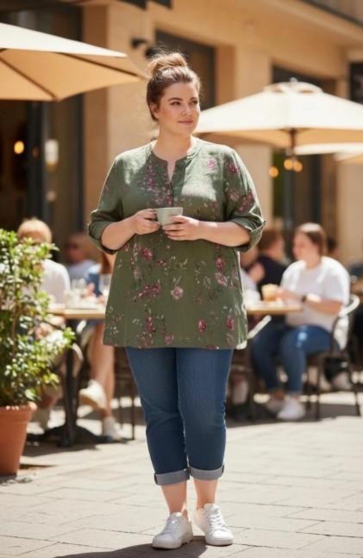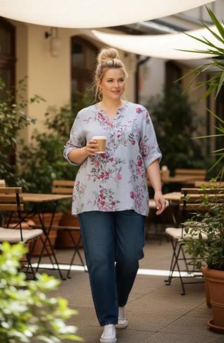 Plusmallisto New Collection sievä kukkapusero mukavan ohutta pellavaa. Edessä pääntien alla napit ja hihaa voi kääntää napin avulla. Malli on yhden koon ja vastaa n. 42-46 kokoa. Tarkastathan mitat.