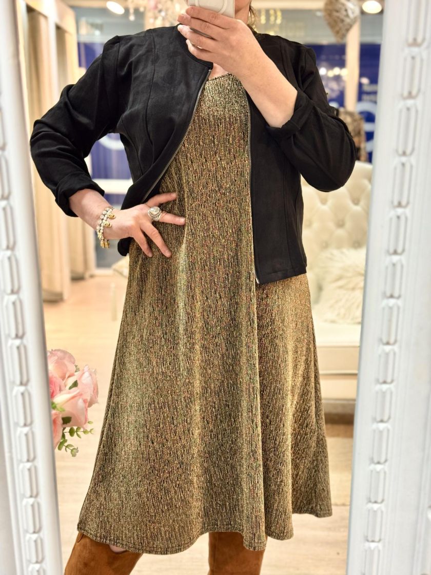 Plusmallistoa New Collection kauniisti kimaltava ja ihanasti joustava lurexmekko. Malli on hieman levenevä ja pituus noin puoleen pohkeeseen. Huolettoman helppo ja superjoustava materiaali. Yhden koon malli noin 44-48 kokoisille. Tarkistathan mitat.