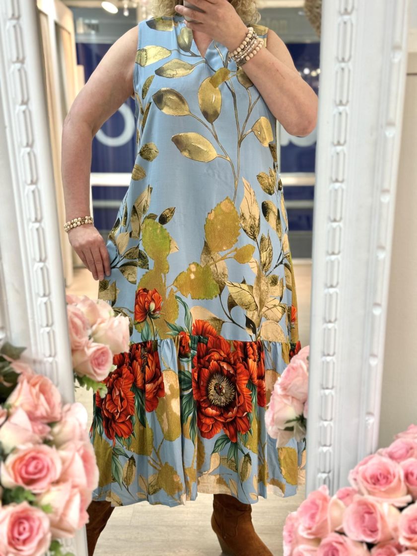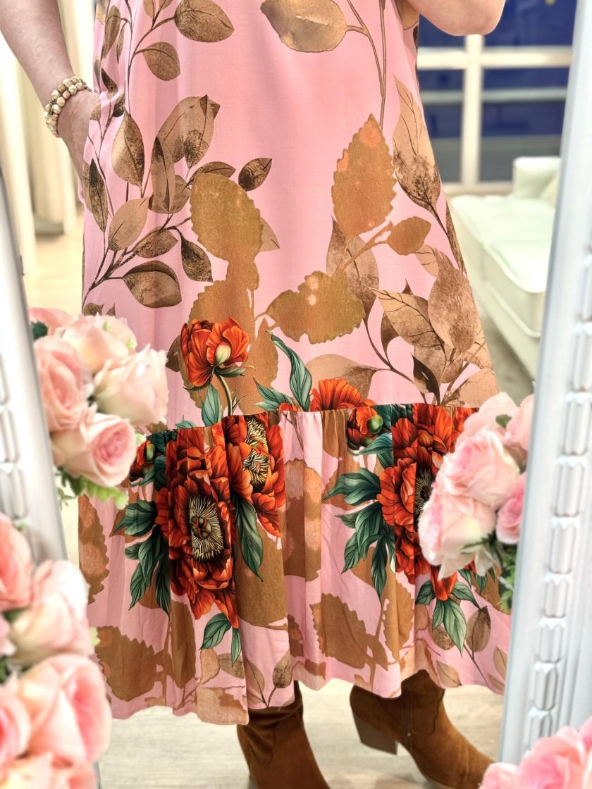 New Collection kaunis kukka-lehti maximekko. Materiaali mukavan ohutta viskoosia. Sivuilla rentoutta tuo taskut ja helmassa liehuva frilla. Yhden koon malli noin 38-42 kokoisille. Tarkistathan mitat.