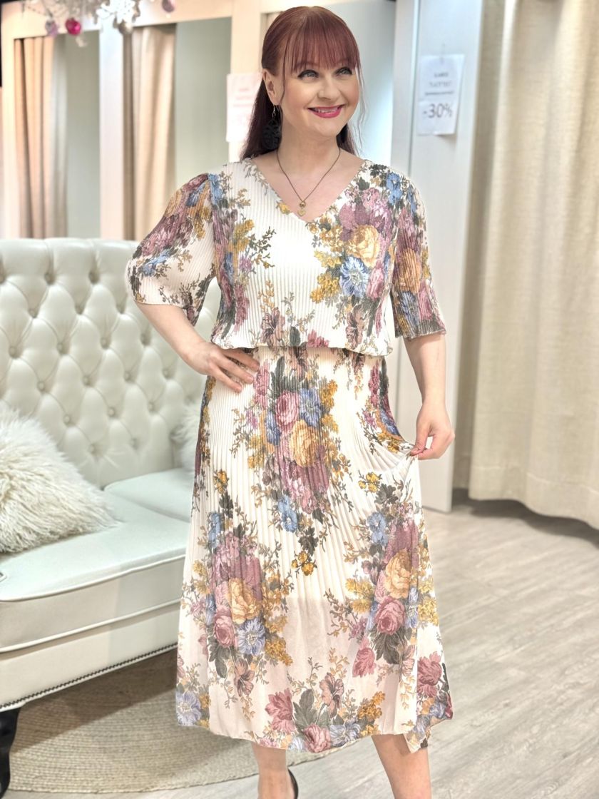 New Collection kauniisti pliseerattu sifonkimekko. Mekossa on kaksi kerrosta, jossa sifonki jää kauniisti yläosan päällä. Vyötäröllä muotoa tuo kuminauha ja hiha on hieman väljä. Alla on hyvin joustava vuori ohutta viskoositrikoota. Yhden koon malli noin 36-40 kokoisille.