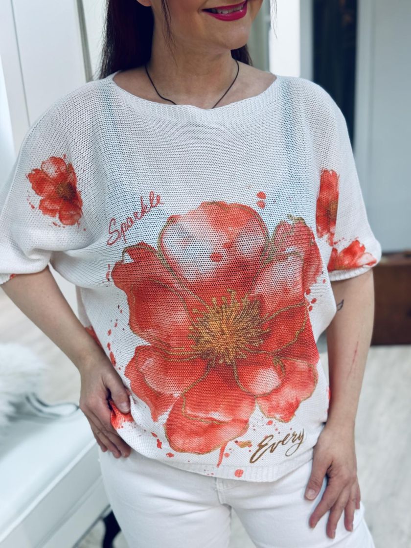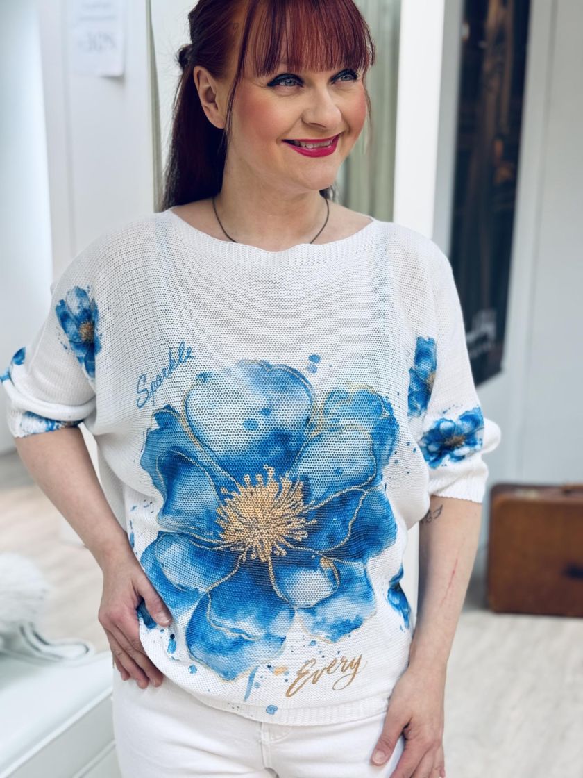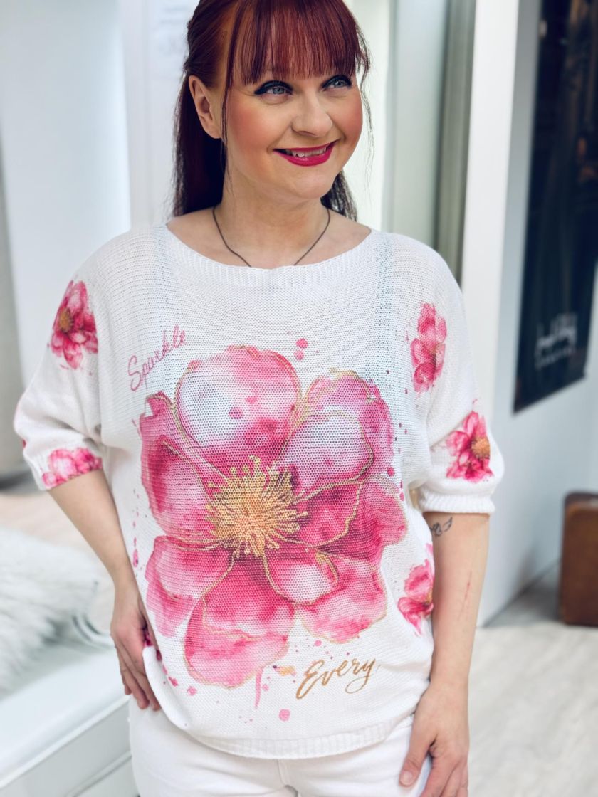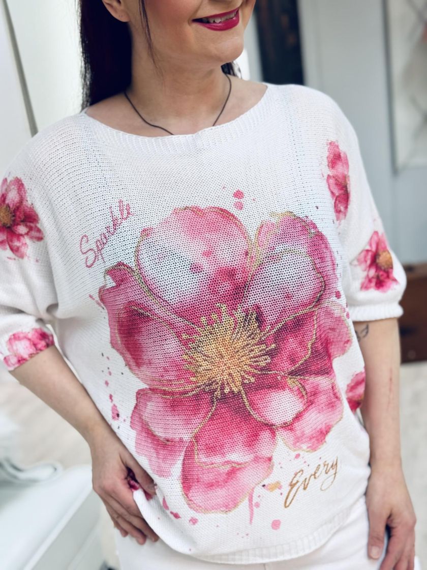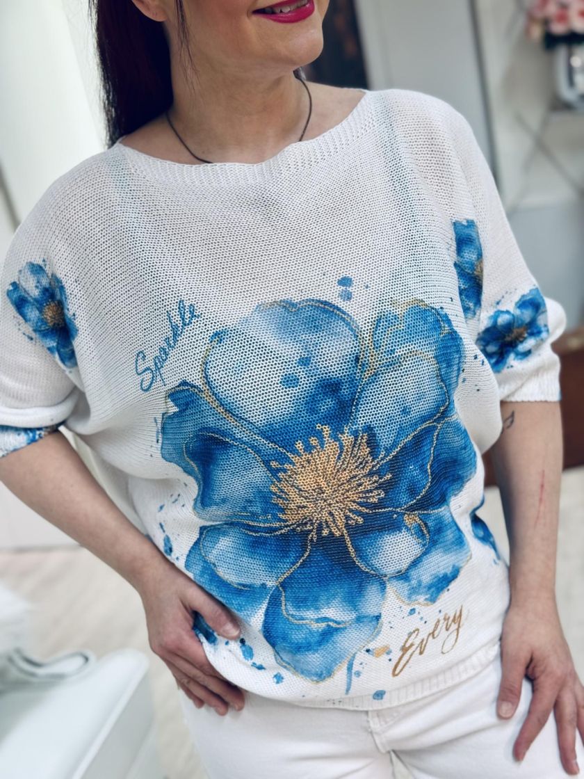 Kiva neulepusero farkkujen kanssa. New Collection kaunis kukallinen reikäneulepusero. Mallissa väljä lepakkohiha ja kapenee helmaa kohden. Materiaali mukavaa viskoosisekoitetta. Malli on yhden koon ja vastaa n.36-40 kokoa. Tarkistathan mitat. Ihanat kevään/kesän värit.