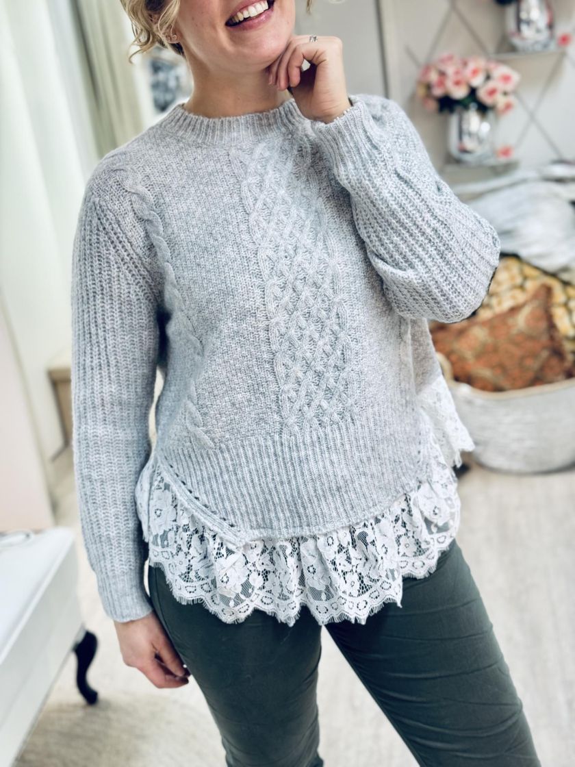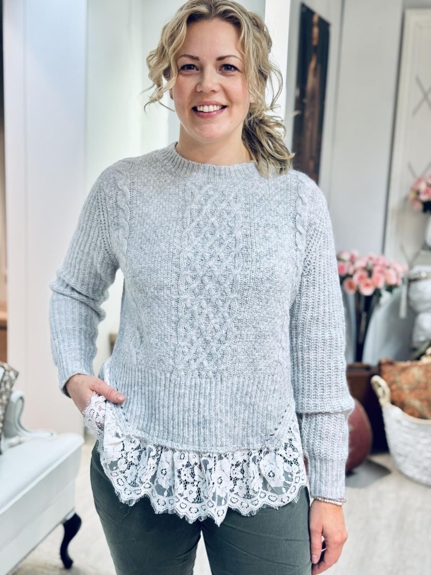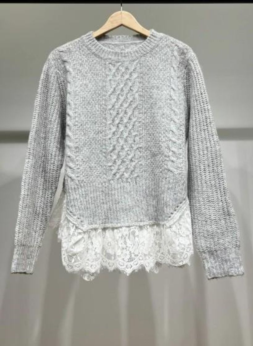 New Collection pehmeä ja pörröinen neulepusero. Puserossa on upea pitsihelma ja kivasti yhdistetty erilaisia neuloksia. Materiaali on kauniisti meleerattu. Yhden koon malli noin 36-42 kokoisille.