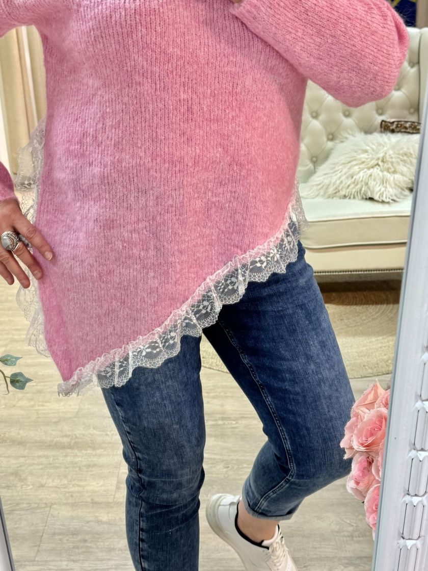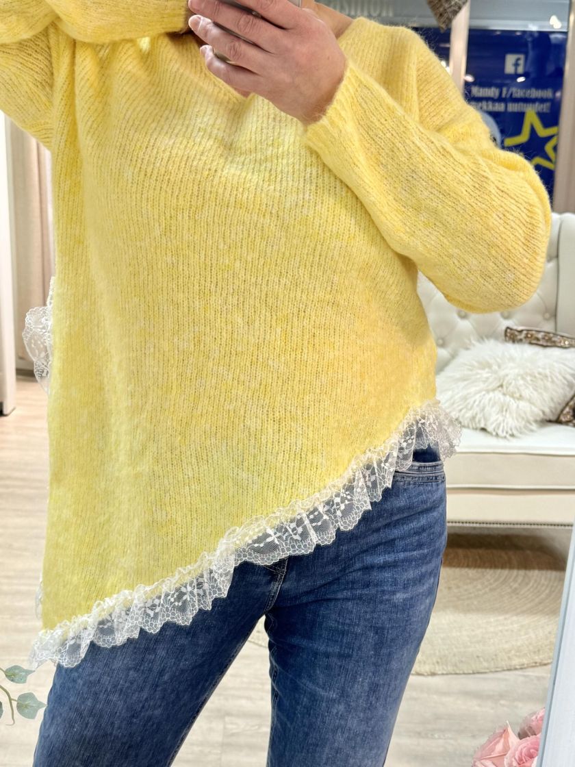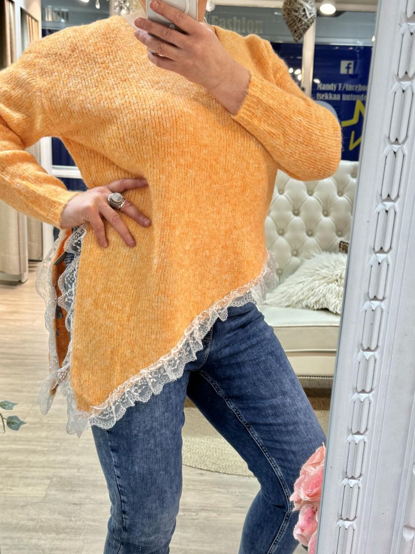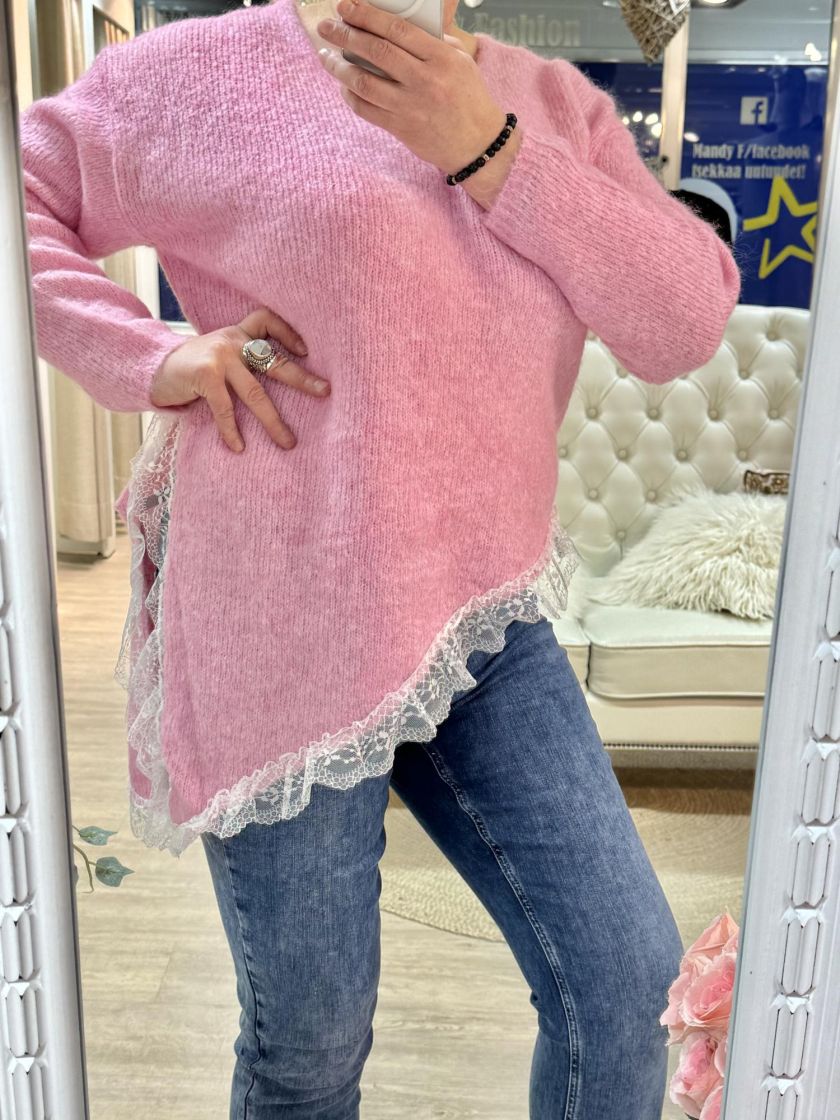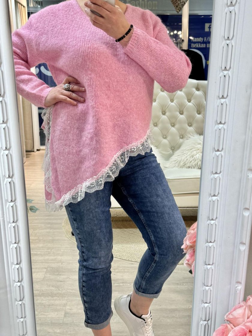 New Collection pehmeä ja pörröinen neuletunika/pusero. Puserossa on vinohelma ja kaunis pitsi helmassa. Mallissa on reilu v-pääntie ja neulos kivasti meleerattua. Yhden koon malli noin 38-42 kokoisille.
