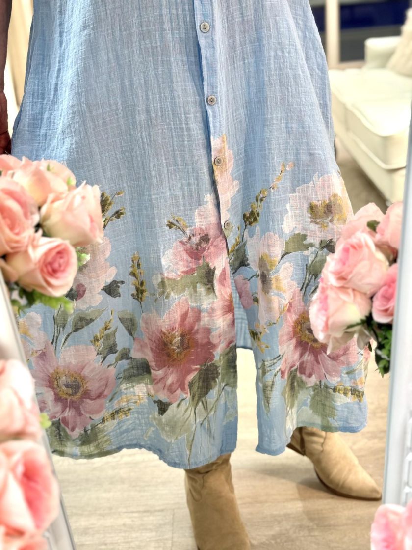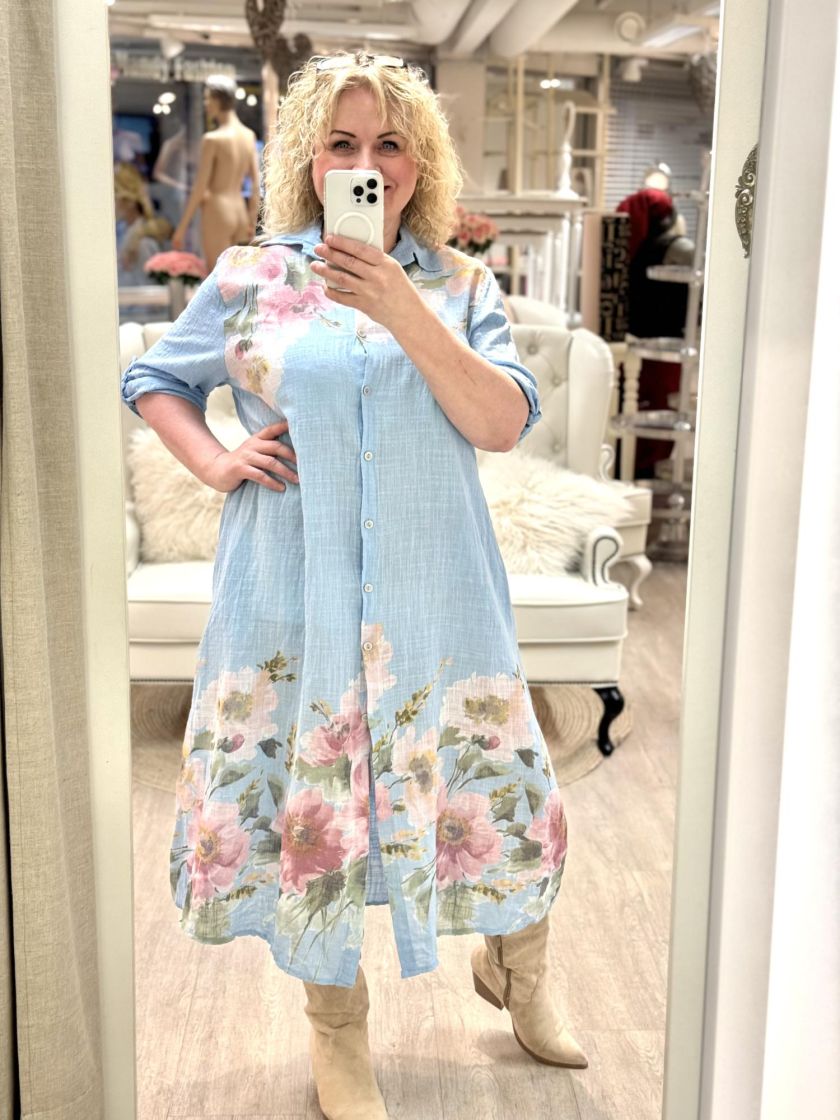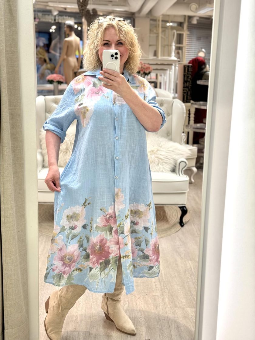 New Collection paitamekko kauniilla kukkakuviolla. Edessä napit ja sivuilla rentoutta tuo taskut. Materiaali ihanan pehmoista puuvillaa. Voi myös pitää jakkuna ja vyö tuo mekkoon linjakkuutta. Yhden koon malli noin 40-44 kokoisille. Tarkistathan mitat.