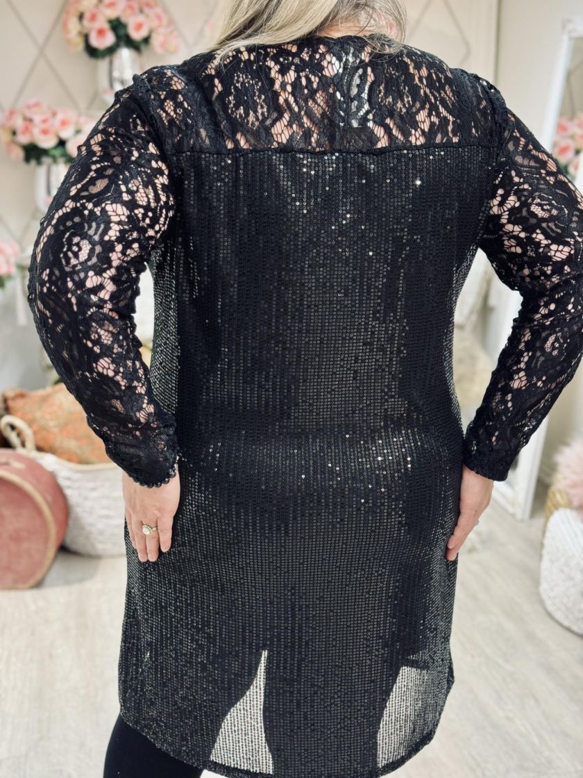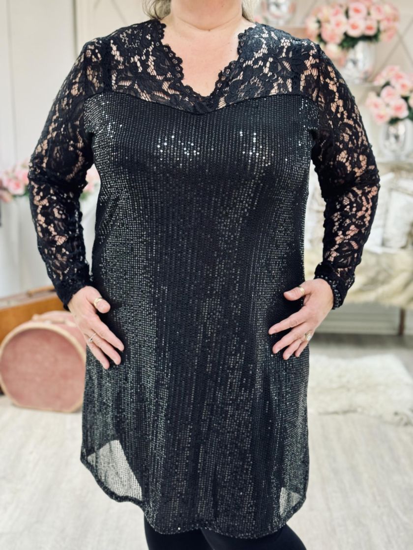 Plusmallistoa New Collection kauniisti kimaltava ja ihanasti joustava paljettimekko. Hihat ja yläosa on kaunista joustopitsiä, jonka kruunaa v-pääntie. Alla ohut sekä erittäin joustava trikoovuori viskoosisekoitetta. Malli on suora ja mitoitus kauniisti istuva. Yhden koon malli noin 44-46 kokoisille. Tarkistathan mitat.