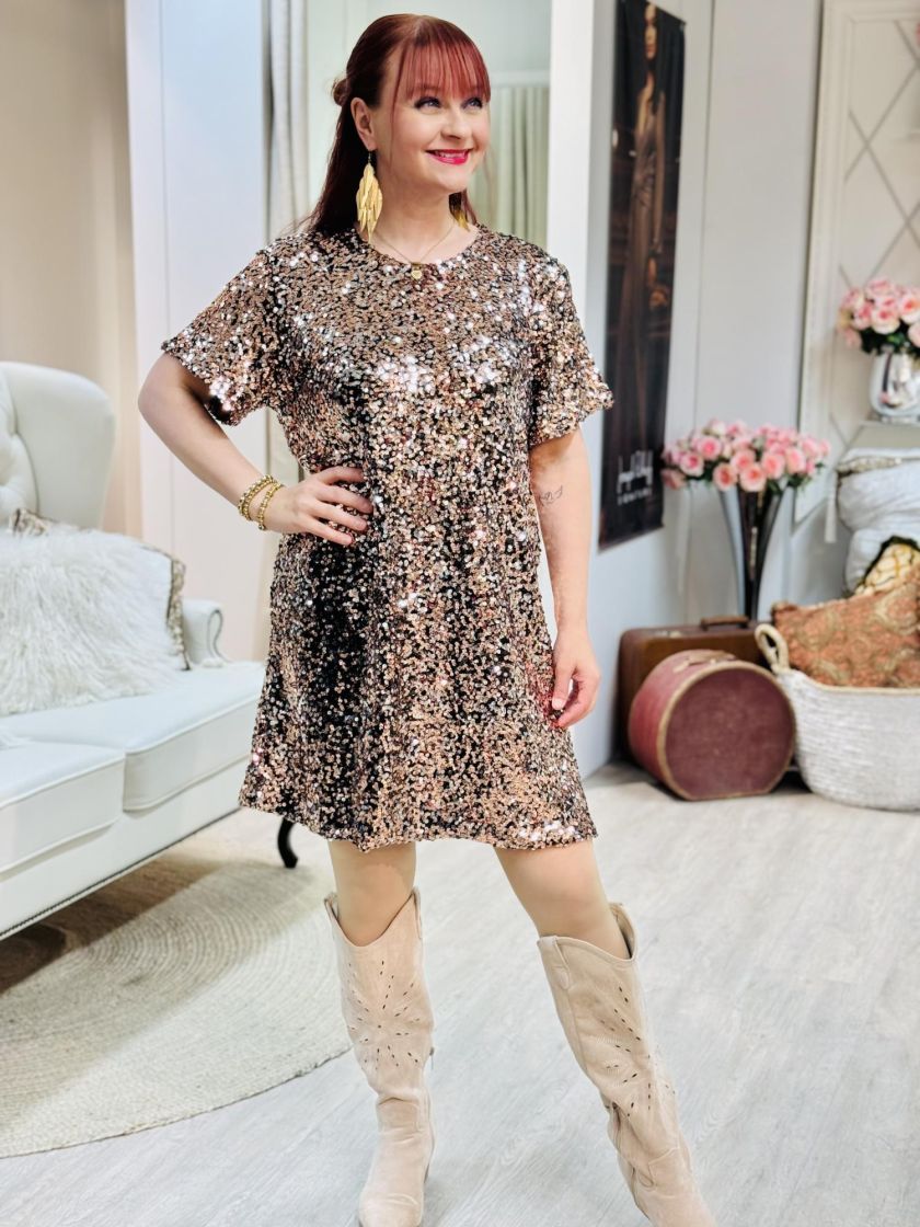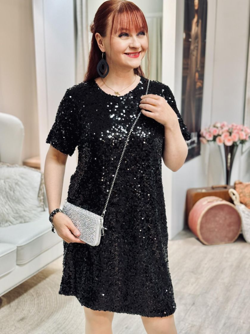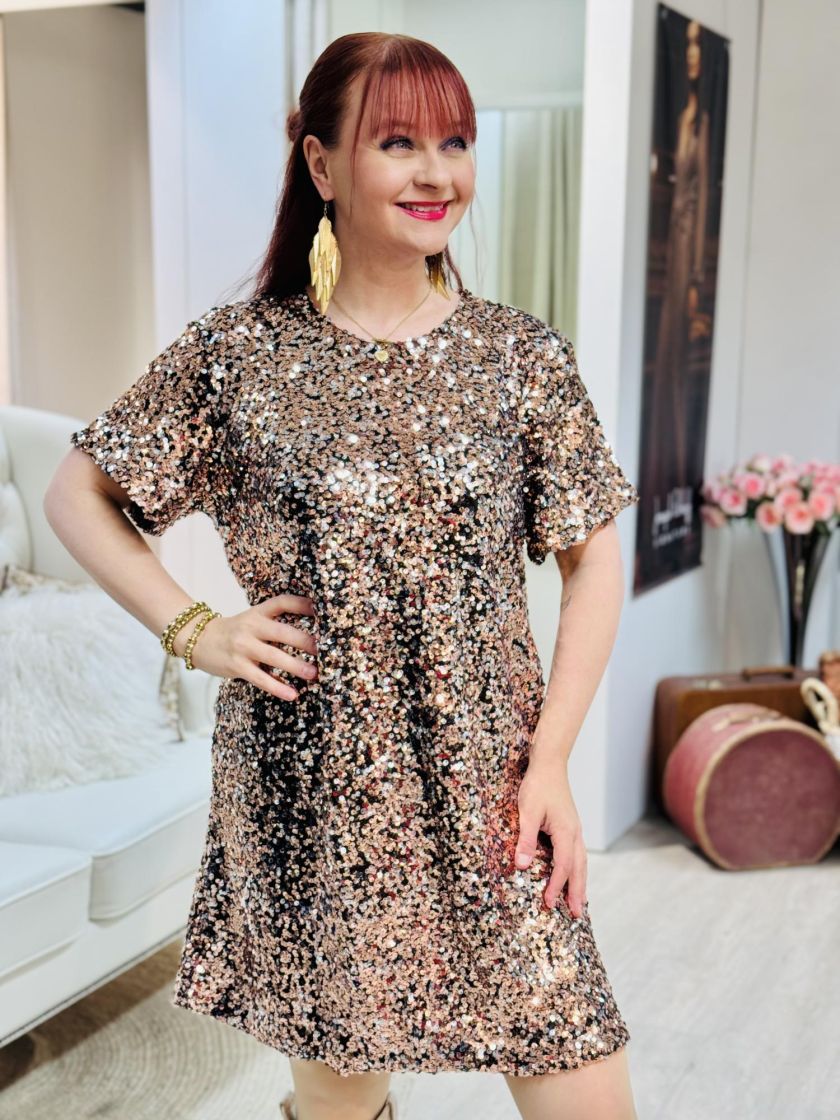 New Collection kauniisti kimaltava ja ihanasti joustava paljettimekko. Mallissa pieni hiha ja alla ohut erittäin joustava trikoovuori viskoosisekoitetta. Malli on hieman a-linjainen. Yhden koon malli noin 38-42 kokoisille. Tarkistathan mitat.