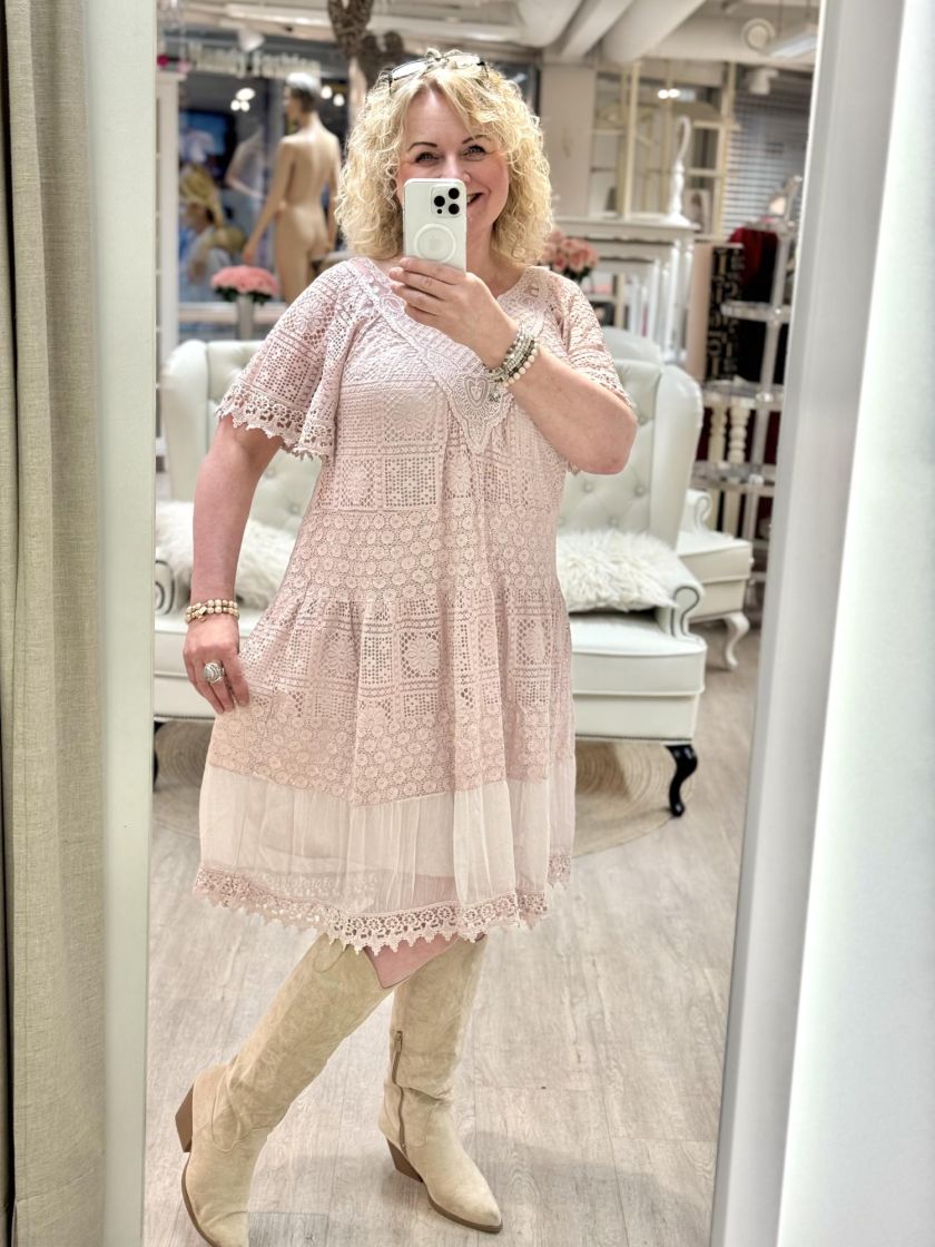 New Collection mekko kauniilla pitseillä. Mallissa on yhdistetty kivasti pitsiä ja silkki-viskoosia. Alla on mukavan joustava trikoovuori. Kaunis pääntie ja söpöt pitsiset hihat. Mekossa kimaltaa paljetteja. Yhden koon malli noin 40-44 kokoisille. Tarkistathan mitat.