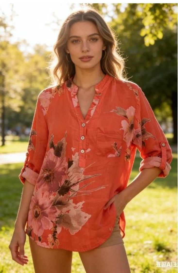 Kauniit värit kesään! New Collection kaunis kukallinen pellavapusero. Pystykaulus ja napitus edessä pääntien alla tekee tyylikkään ilmeen. Edessä kiva pieni rintatasku. Helma on kaarrettu ja hihaa voi kääntää napin avulla.