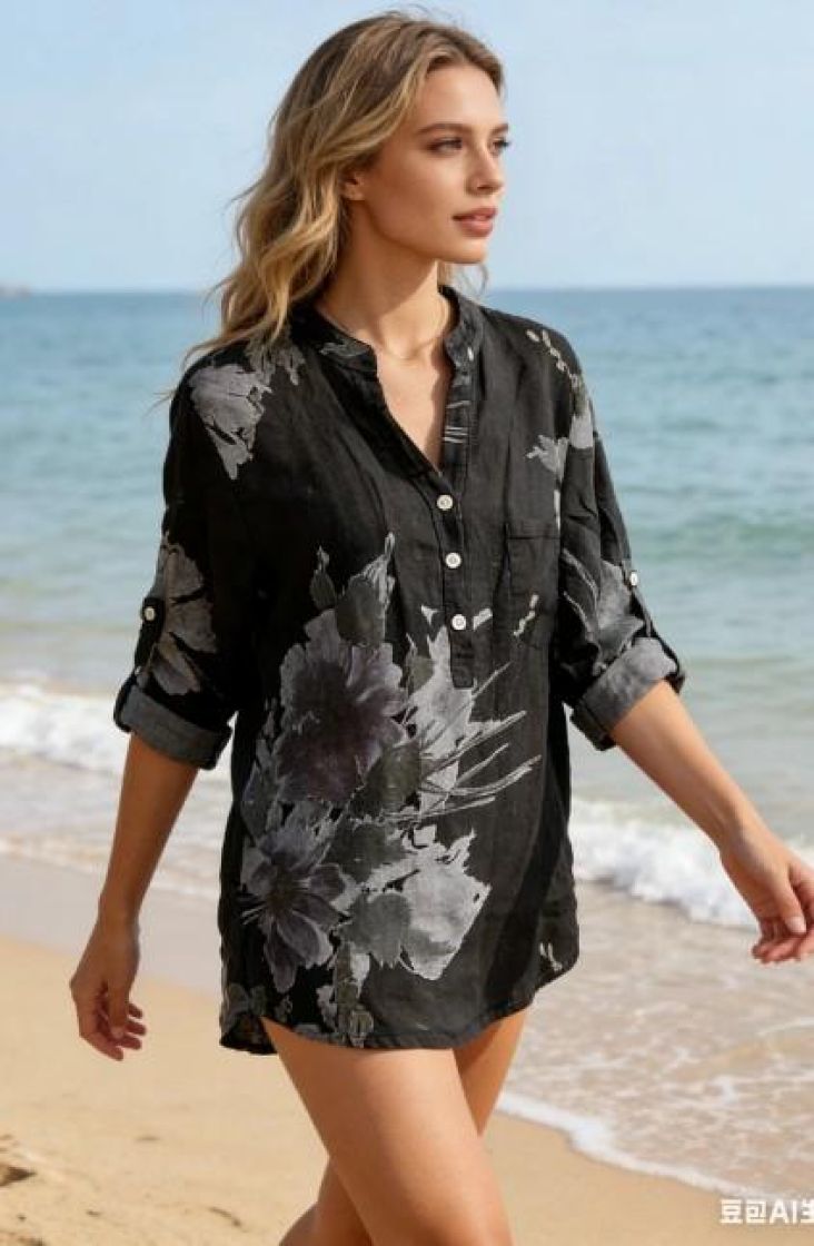New Collection kaunis kukallinen pellavapusero. Pystykaulus ja napitus edessä pääntien alla tekee tyylikkään ilmeen. Edessä kiva pieni rintatasku. Helma on kaarrettu ja hihaa voi kääntää napin avulla.