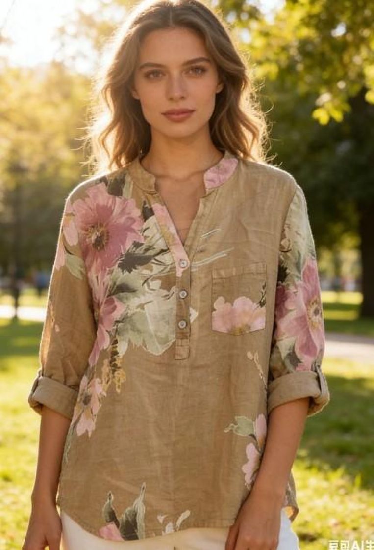 New Collection kaunis kukallinen pellavapusero. Pystykaulus ja napitus edessä pääntien alla tekee tyylikkään ilmeen. Edessä kiva pieni rintatasku. Helma on kaarrettu ja hihaa voi kääntää napin avulla.