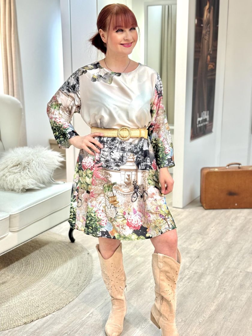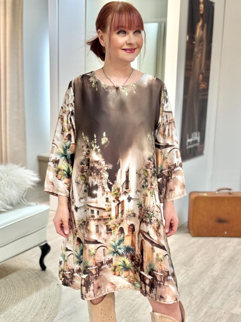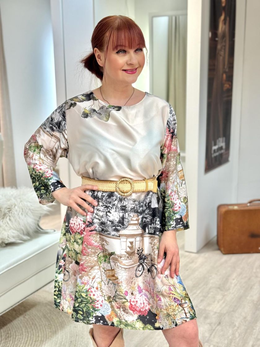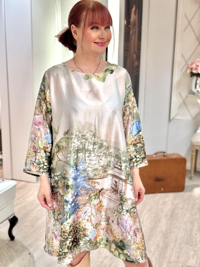 New Collection kaunis satiinipintainen hieman kiiltävänpintainen kuviollinen tunikamekko. Kuvioinnissa on maisemaa, polkupyörä ja puutarhamaisia elementtejä. Kangas laskeutuu kauniisti ja kevyesti. Mekoissa on eri kuviointia. Vyöllä saa istuvuutta mekkoon. Malli on istuvampi yläosasta ja levenee helmaa kohden. Yhden koon malli ja vastaa n.36-42 kokoa.