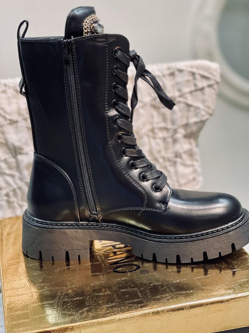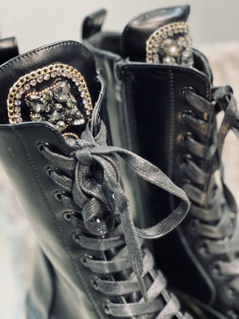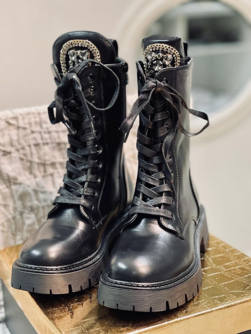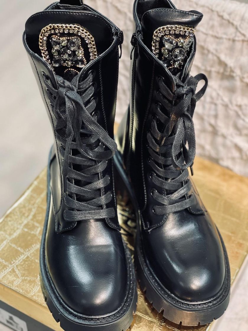 New Collection kevyet maiharit reilulla traktoripohjalla ja upealla strassikoristeella. Sisäsivulla on vetoketju ja edessä nauhat. Materiaali on kevyttä, ohutta ja hieman kiiltopintaista keinonahkaa. Sisällä on ohut sekä pehmeä vuori. Normaali mitoitus.