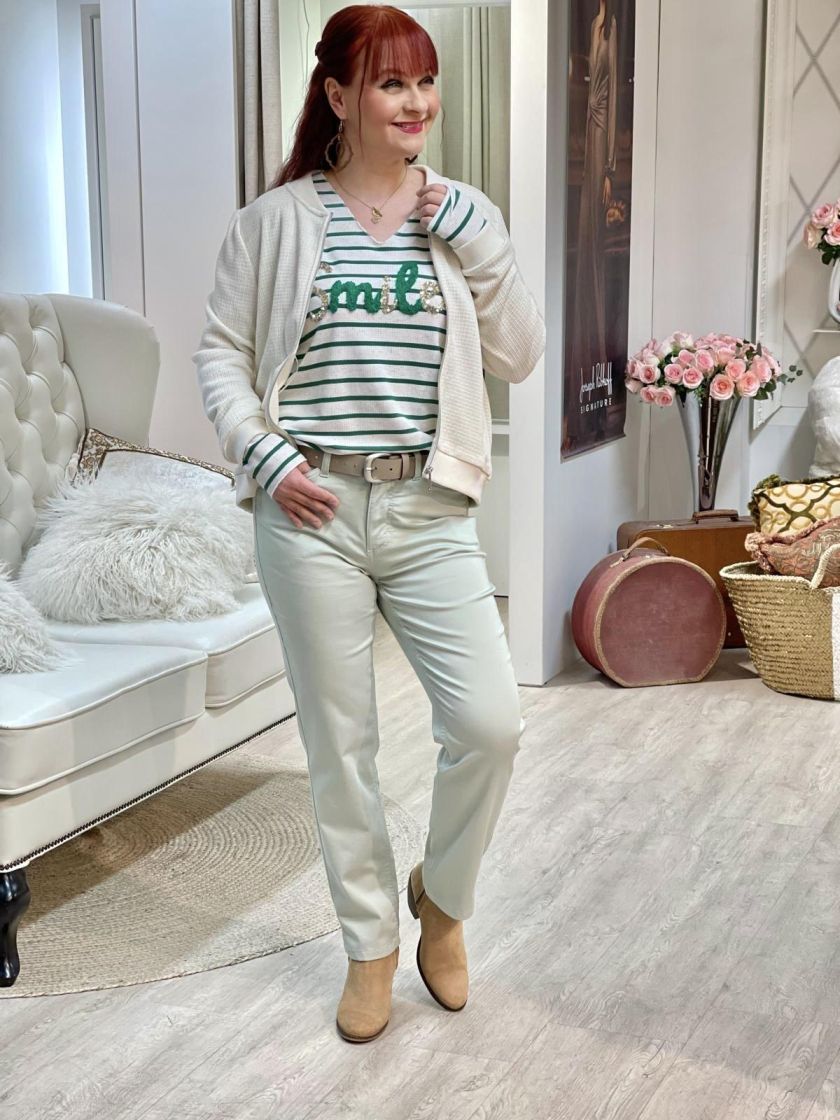New Collection raitapaita miellyttävää viskoosi-pellavatrikoota. Edessä on teddy-paljettiteksti smile ja materiaali on kivasti meleerattu. Paidassa on avoin v-pääntie ja kauniisti istuva malli. Yhden koon malli noin 36-40 kokoisille.