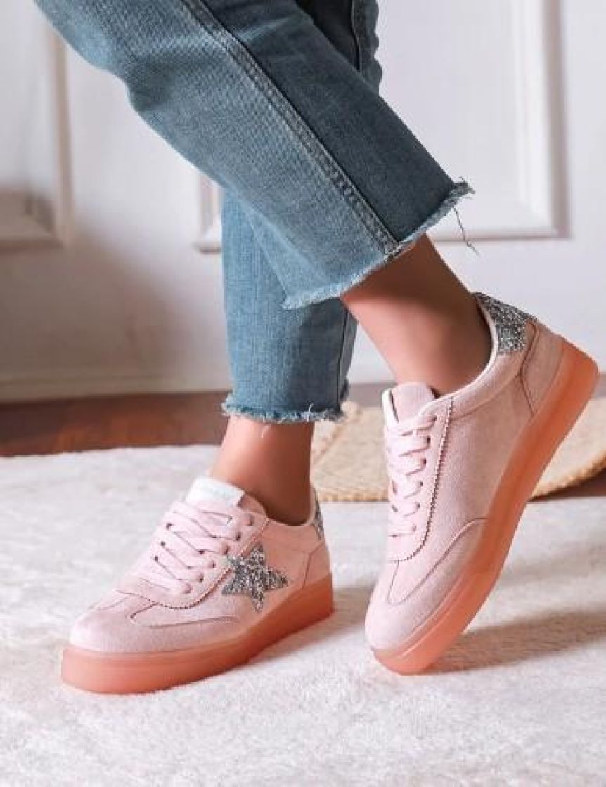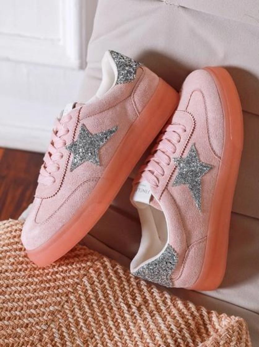 New Collection tennarit pehmeää roosanväristä keinomokkaa. Jujuna on makea tähti ja takaosa hopeahilettä. Edessä on nauhat ja kenkien materiaali on kevyttä. Malli on hieman kapeampi ja mitoitus aavistuksen pienempi.