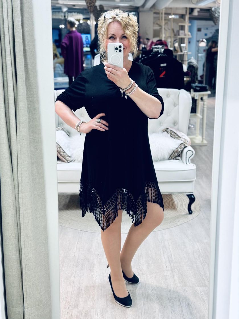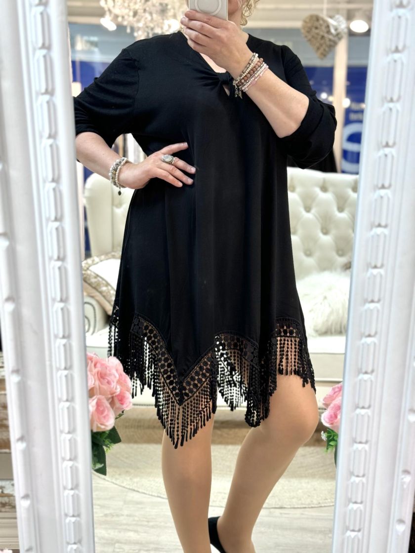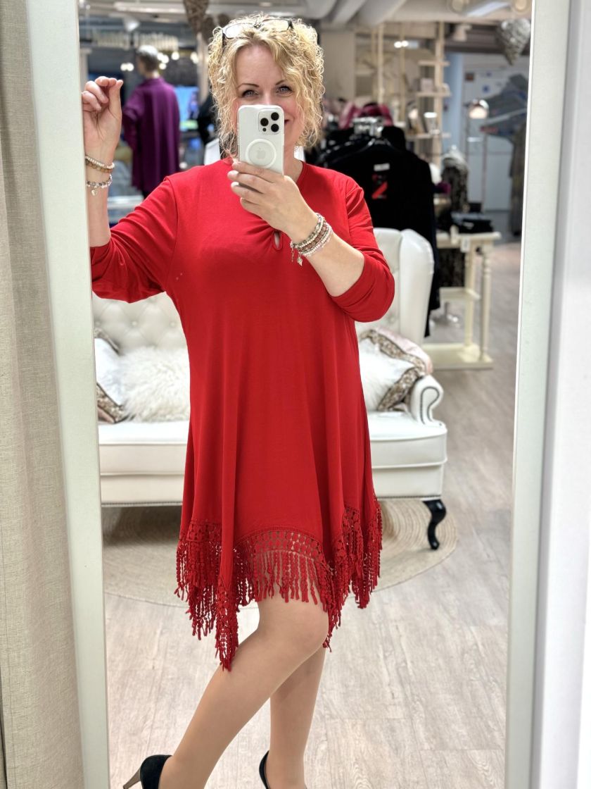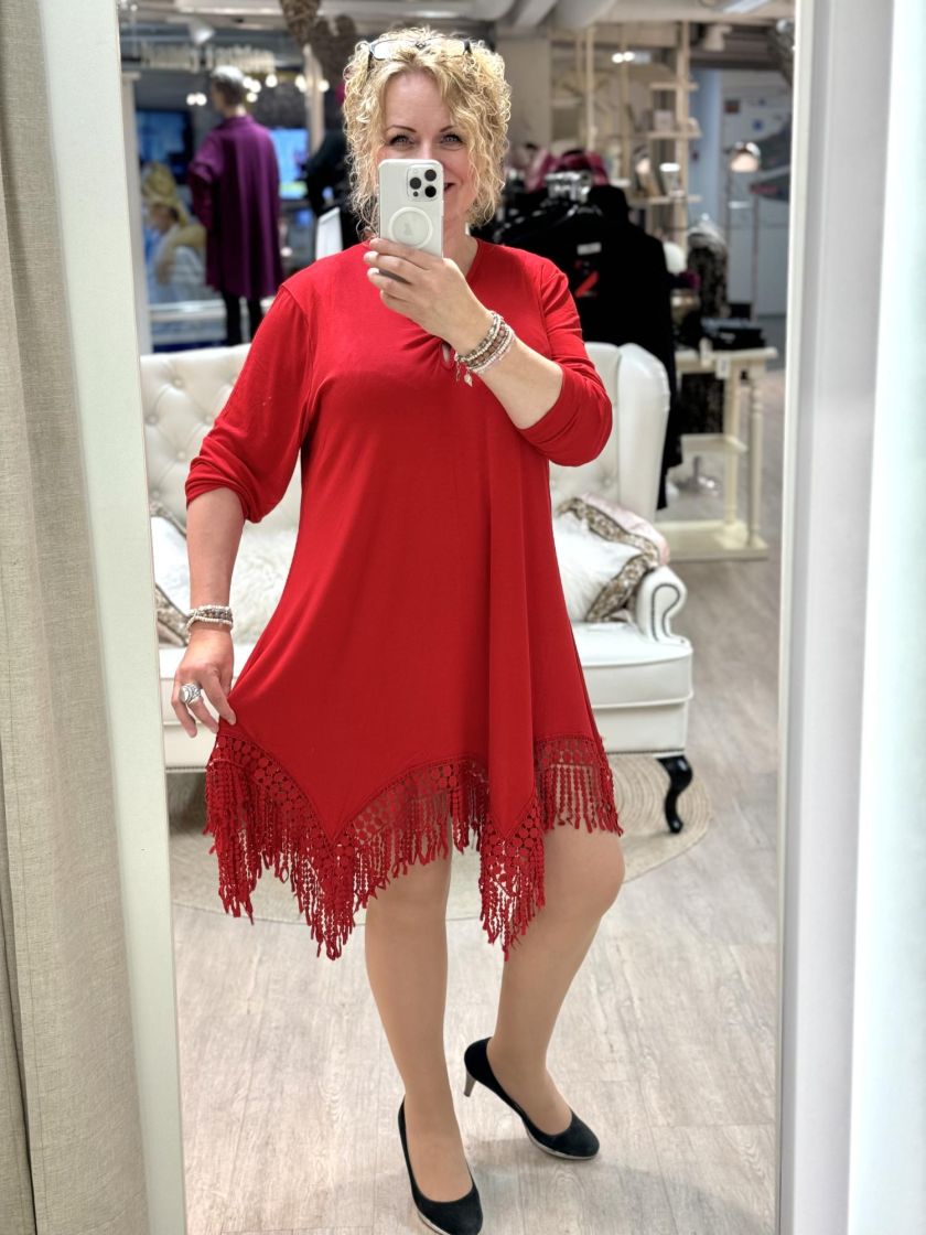 Plusmallistoa New Collection trikoomekko. Mekossa on kaunis v-pääntie ja helmassa upea hapsupitsi. Malli on a-linjainen ja materiaalina mukavan ohut ja joustava viskoositrikoo. Mitoitus on reilu ja materiaali hyvin mukautuvaa, joten tarkistathan mitat.