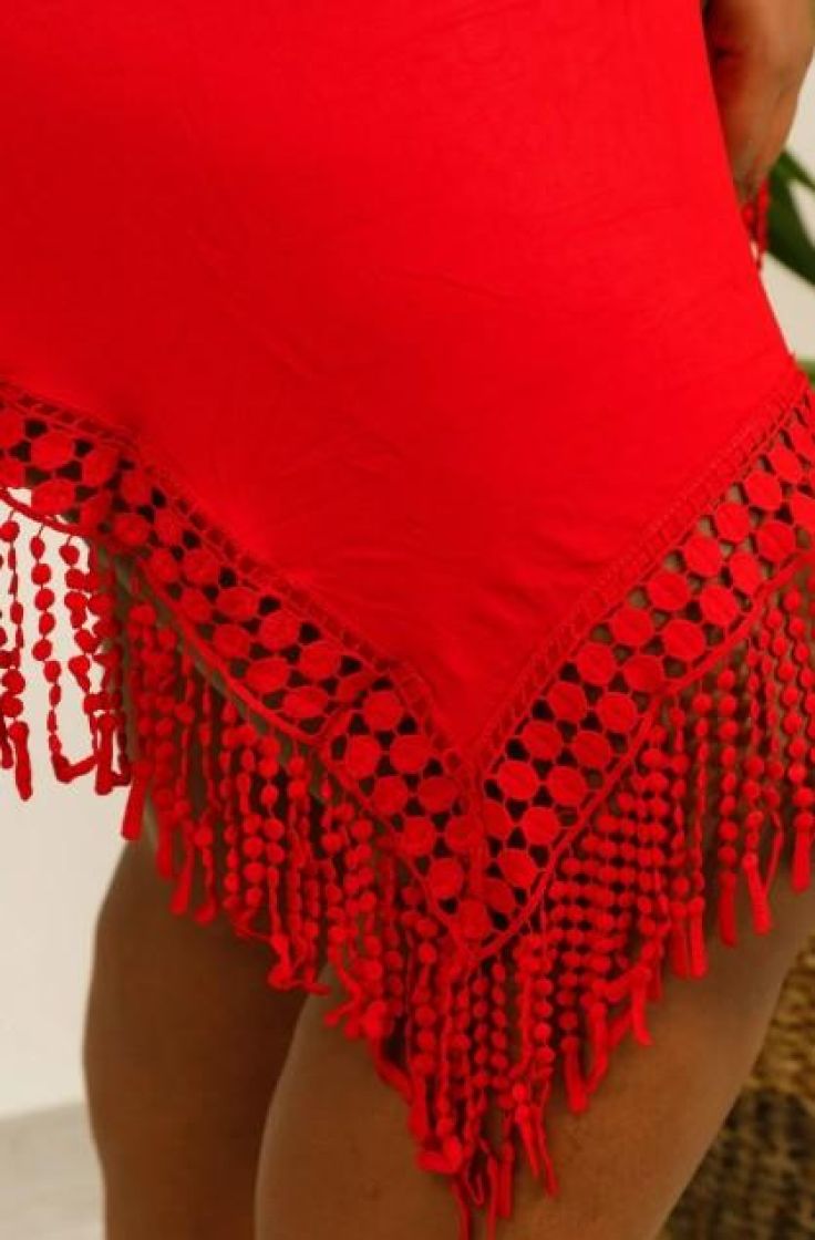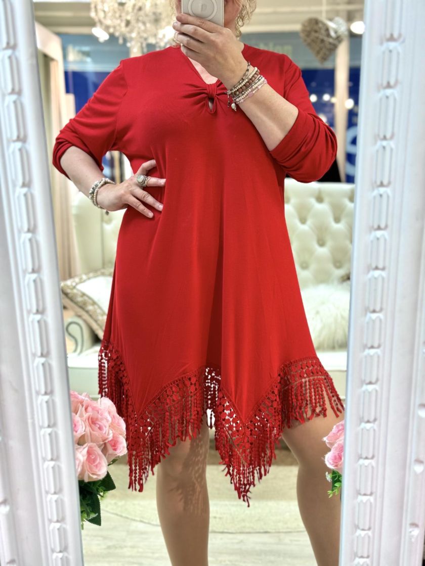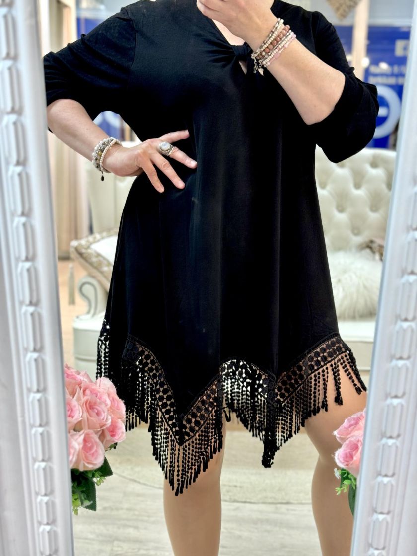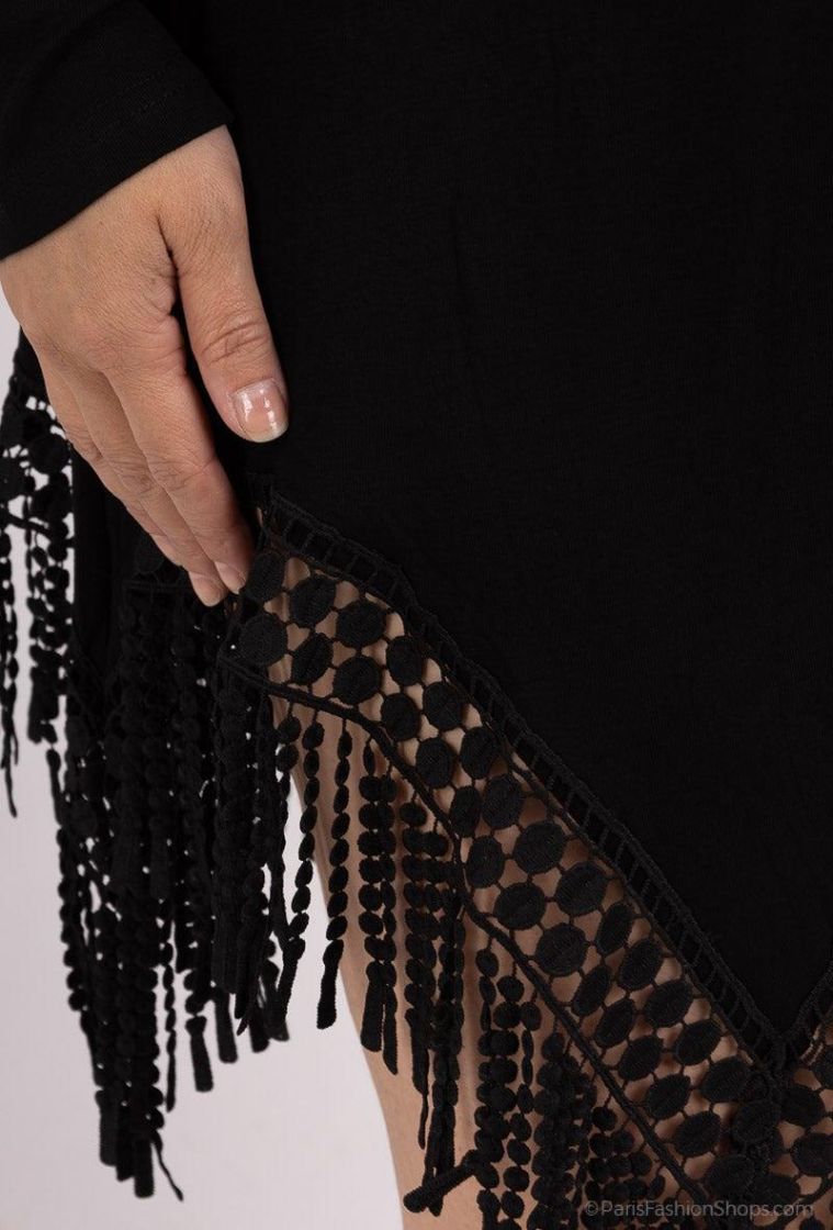 Plusmallistoa New Collection trikoomekko. Mekossa on kaunis v-pääntie ja helmassa upea hapsupitsi. Malli on a-linjainen ja materiaalina mukavan ohut ja joustava viskoositrikoo. Mitoitus on reilu ja materiaali hyvin mukautuvaa, joten tarkistathan mitat.