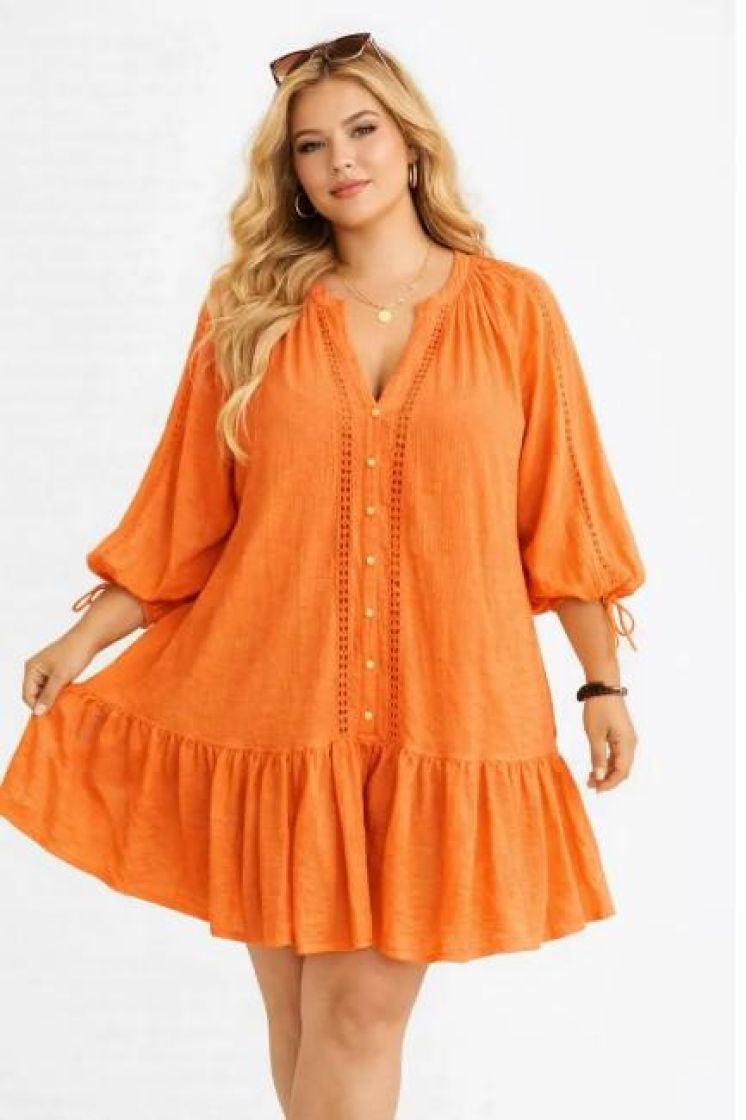 Plusmallisto New Collection söpö tunikamekko. Materiaali pumpulin pehmeää puuvillaa. Koristenapit edessä ja hihansuussa kuminauharesori nauhalla tuo ryhtiä hihoihin ja pitää ne paikoillaan. Helmassa kaunis frilla. Yhden koon malli noin 46-50 kokoisille. Tarkistathan mitat.