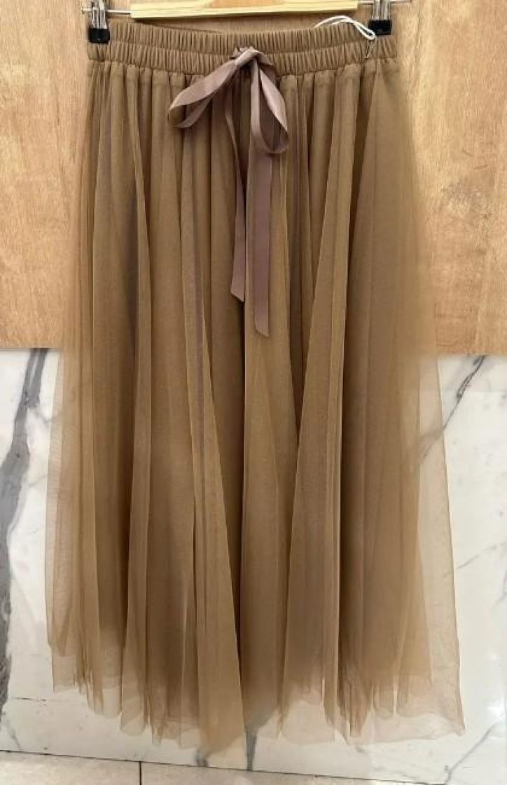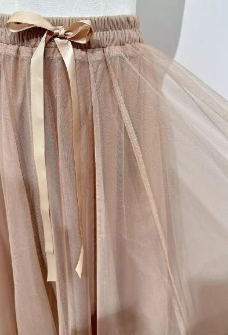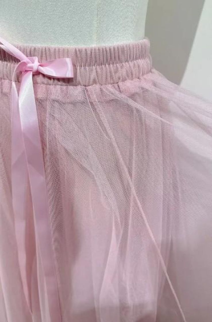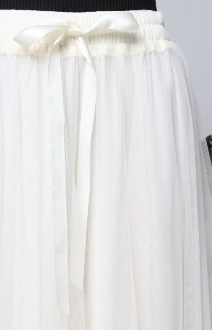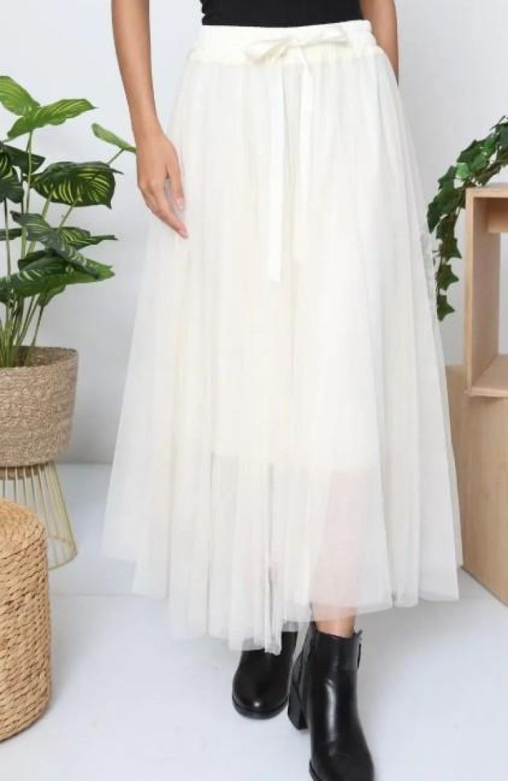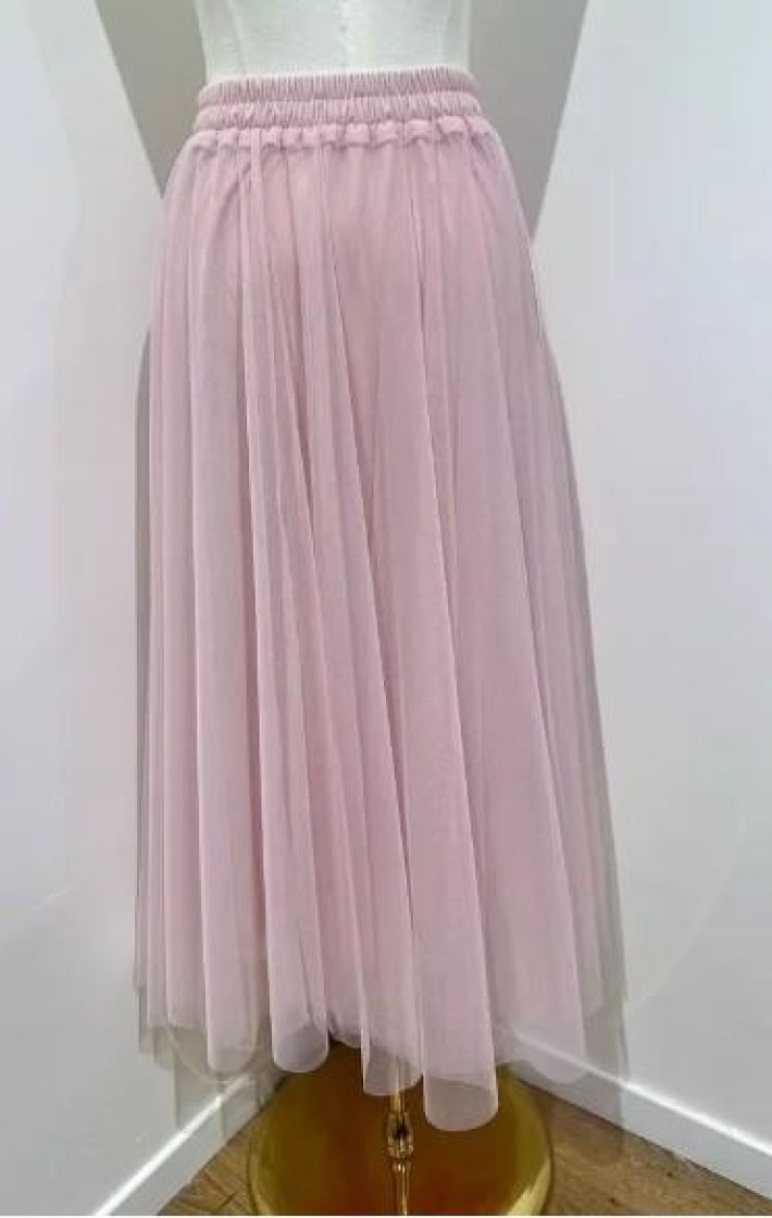 New Collection kaunis tyllihame. Malli on kellohelmainen ja vyötäröllä mukavuutta antaa joustava vyötärönauha. Vyötärönauhan kruunaa solmittavat satiininauhat. Alla on ohut ja joustava vuori. Yhden koon malli noin 36-44 kokoisille.