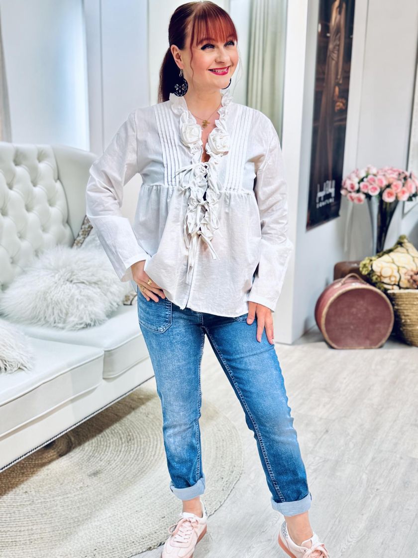 New Collection frillajakku/pusero kevyttä ja ohutta puuvillaa. Pääntiellä on kauniit frillat ja ruusukkeet. Edessä lisäilmettä antaa hiuslaskokset ja kiinnitys on nauhoilla.