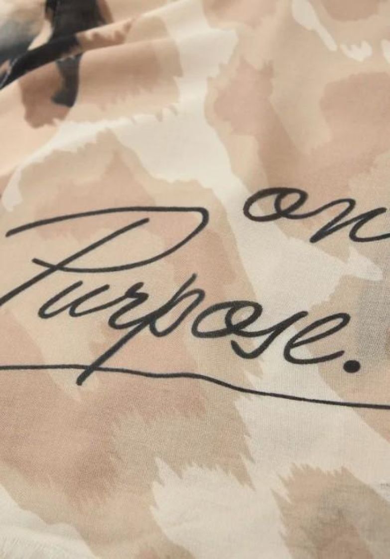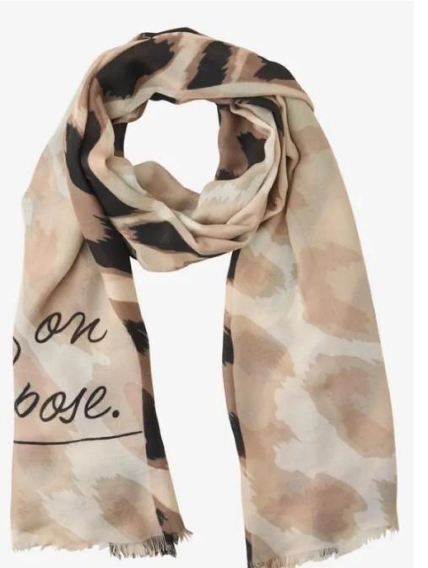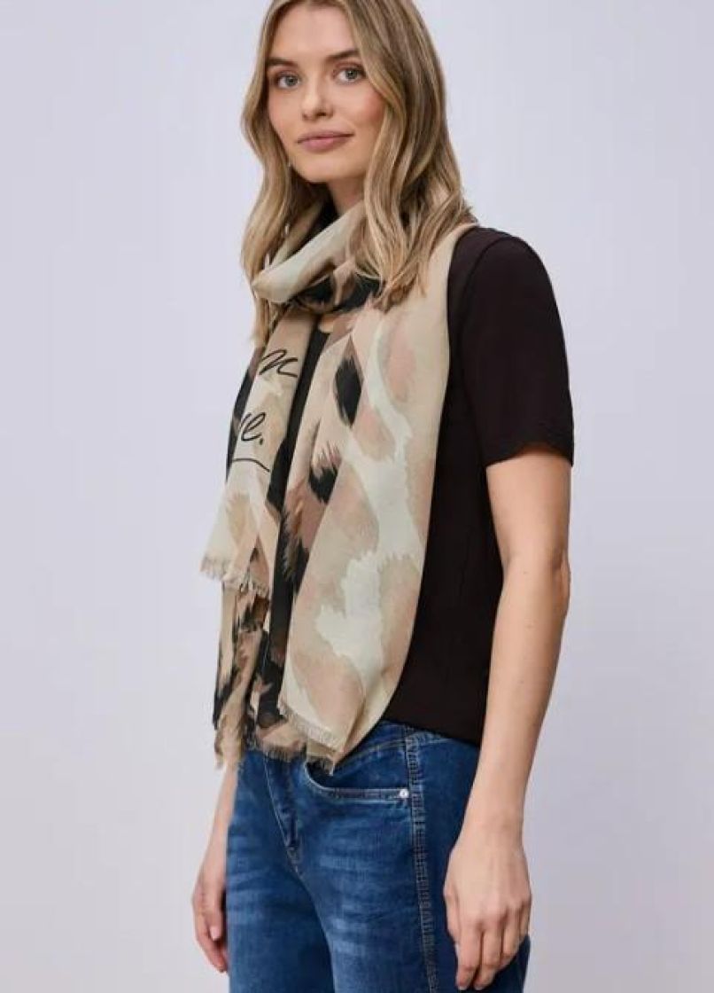 Street One makee leo kuviollinen huivi. Materiaali pehmeää ja ohutta modaalia. Huivissa on tekstiä ja reunat kivasti hapsutettu. Huivi sopii hyvin sisä- ja ulkokäyttöön.