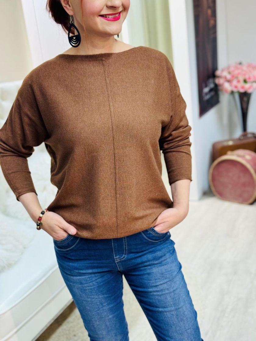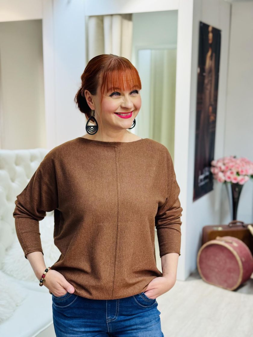 Street One neulepusero ohutta ja pehmeää meleerattua neulosta. Malli kapenee hieman helmaa kohti ja edessä keskellä ilmettä antaa sauma. Puserossa on venepääntie. Mitoitus on normaali.