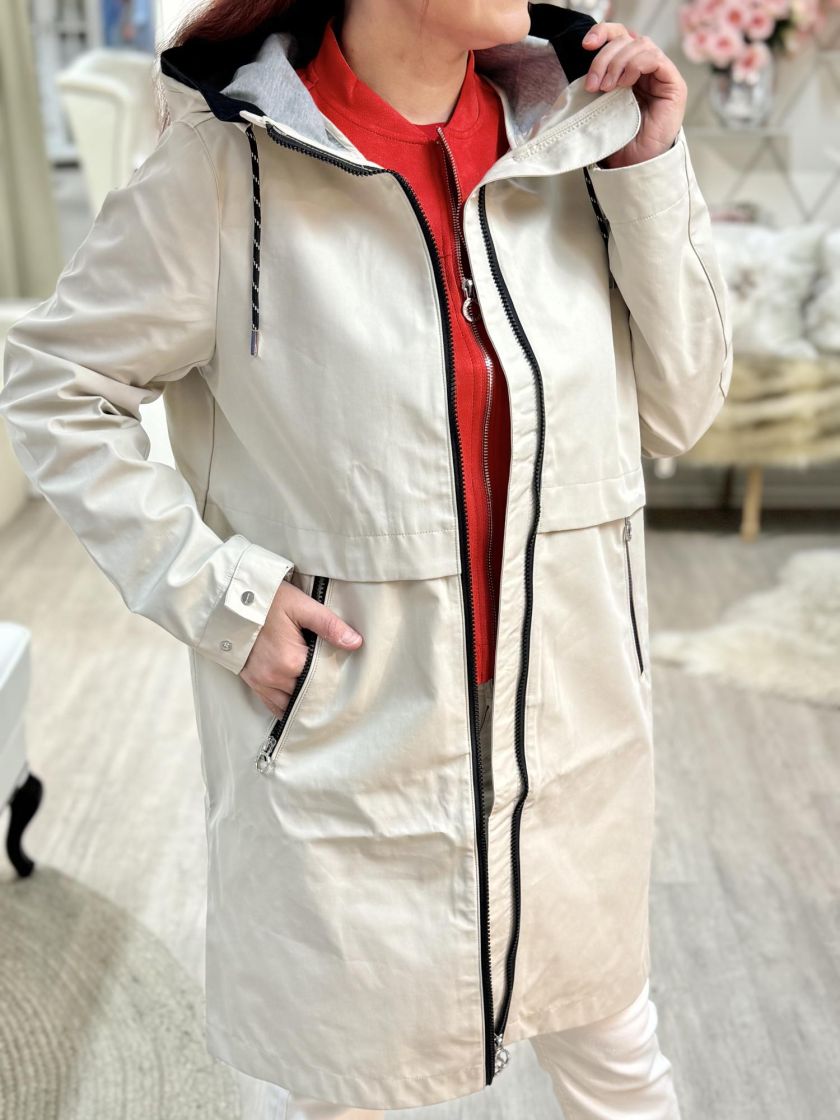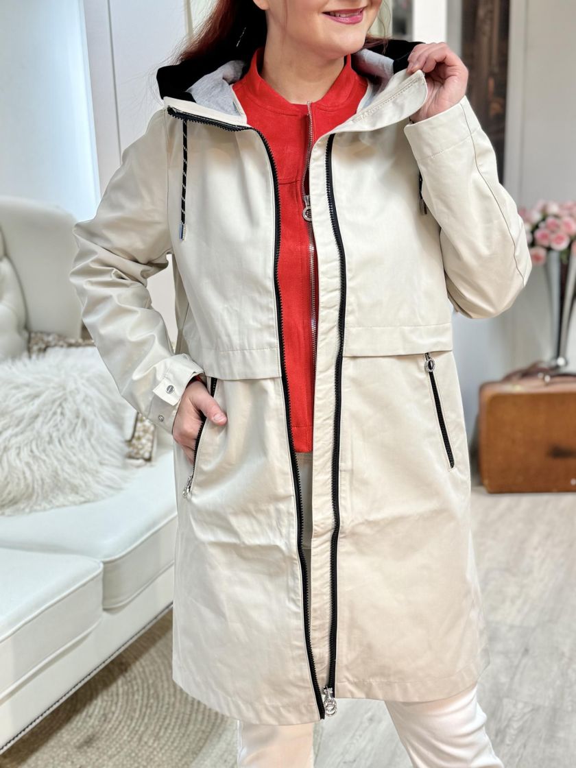 Street One tyylikäs puolipitkä parkatakki. Materiaali on valmistettu mukavasta puuvillasekoitteesta. Sivuilla vetoketjutaskut ja hupussa kiristysnyörit. Helma on hieman pyöristetty. Takissa on vettähylkivä pinta. Normaali mitoitus.