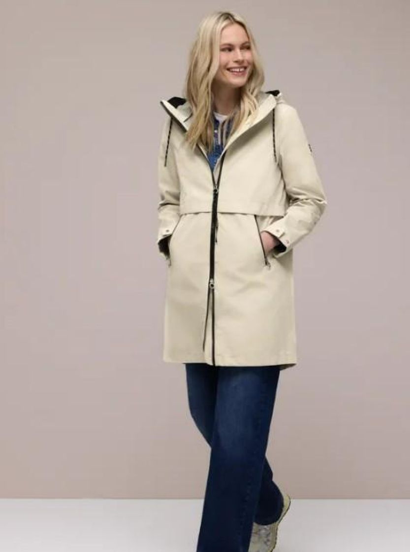 Täydellinen ulkoilutakki arkeen. Street One tyylikäs puolipitkä parkatakki. Materiaali on valmistettu mukavasta puuvillasekoitteesta. Sivuilla vetoketjutaskut ja hupussa kiristysnyörit. Helma on hieman pyöristetty. Takissa on vettähylkivä pinta. Normaali mitoitus.