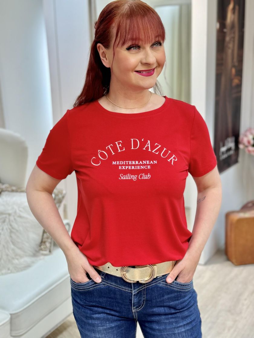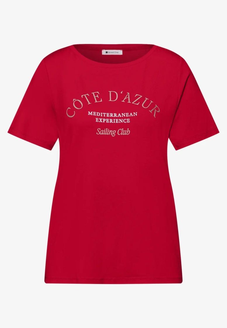 Street One t-paita upeissa kevään väreissä. Kivaa fiilistä tuo edessä reilu Sailing Club printti. Materiaalina ihana ohut viskoositrikoo, joka hengittää ja joustaa. Mitoitus on normaali.
