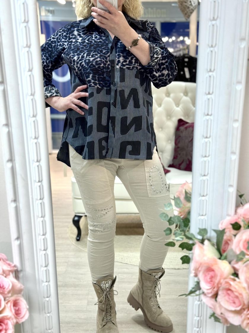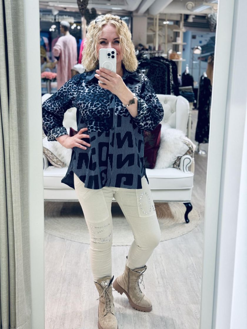 Plusmerkiltä Studio paitis yhdistäen kivasti farkkuhenkistä raita-kirjainkangasta ja leokuosista viskoosisekoitetta. Malli levenee helmaa kohden ja helma on kauniisti kaarrettu sekä takaa pidempi. Edessä on napitus ja hihansuussa nappikaitale. Raitakangas on hieman paksumpaa joustopuuvillaa, leokangas ohutta ja hieman siftavaa viskoosisekoitetta. Mitoitus on reilu, joten tarkistathan mitat.