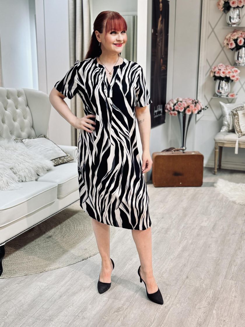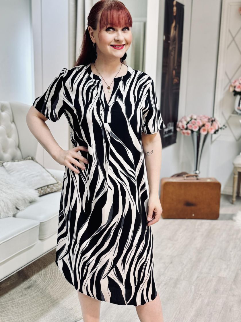 Sunday mekko kauniilla kuviolla. Materiaali todella miellyttävän pehmeää viskoosia. Pääntien alla laskos ja pienet hihat. Malli on suora ja linjakkuutta saa vyöllä.