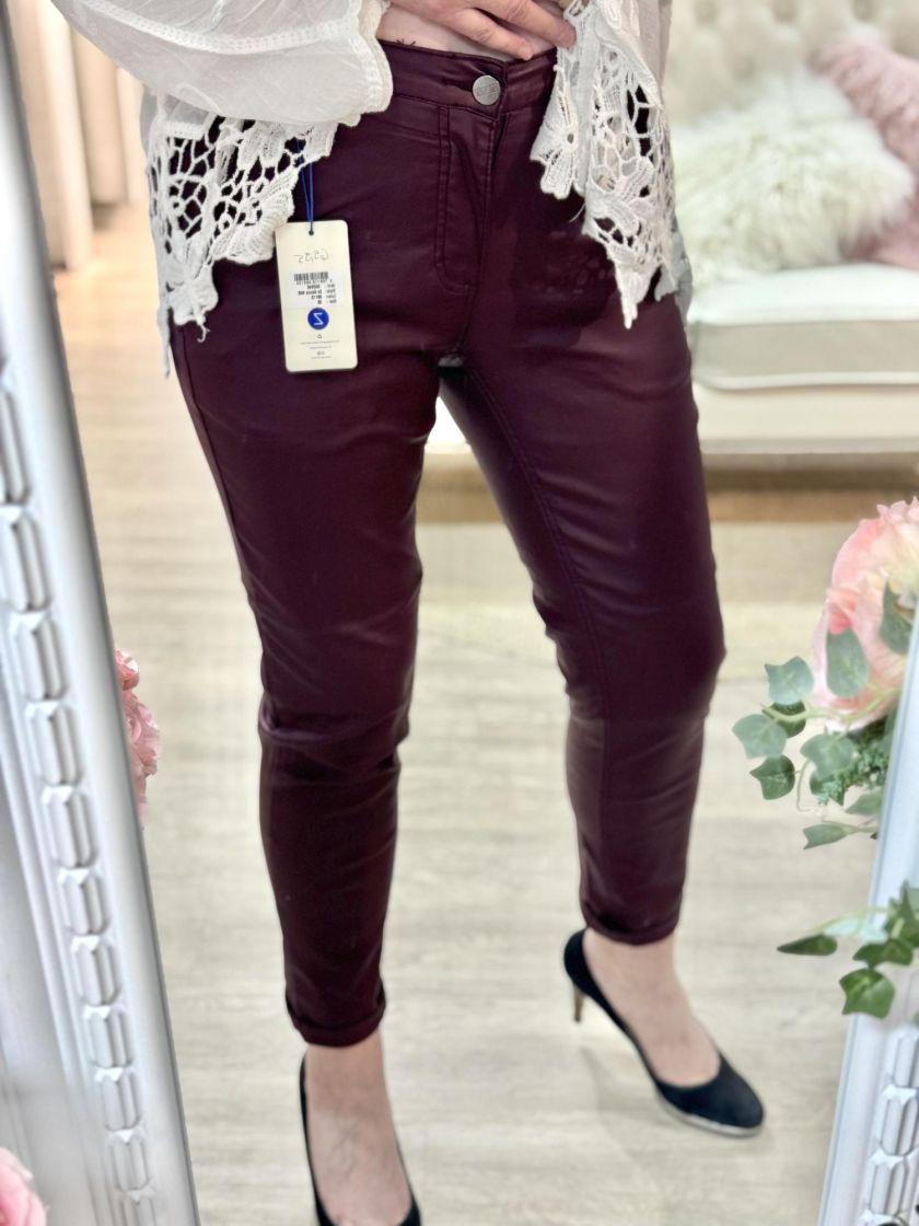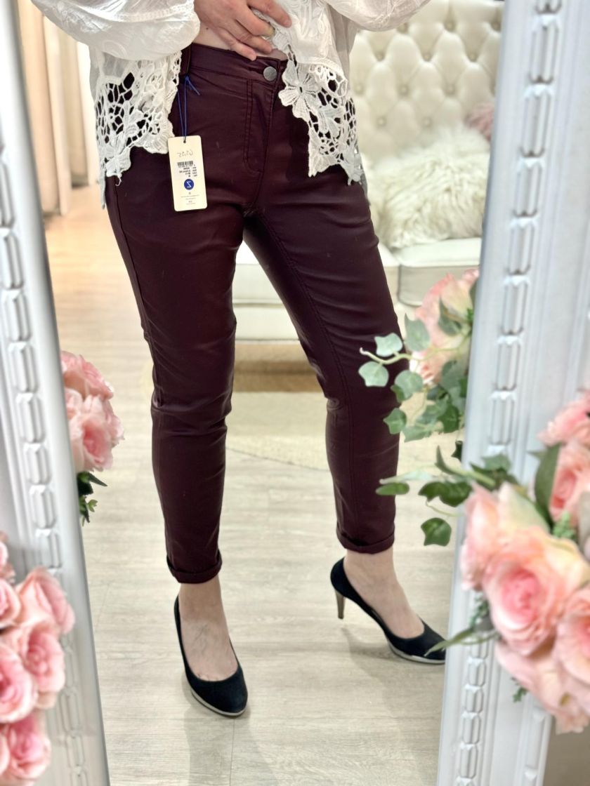 ZE-ZE housut makealla koutatulla kankaalla. Kangas on ohut sekä hyvin joustava ja siinä on vahamainen liukas pinta. Edessä on taskut ja takana valetaskut. Malli on kapeneva ja vyötärönkorkeus normaali. Koon voi ottaa normaalikokoa pienempänä.