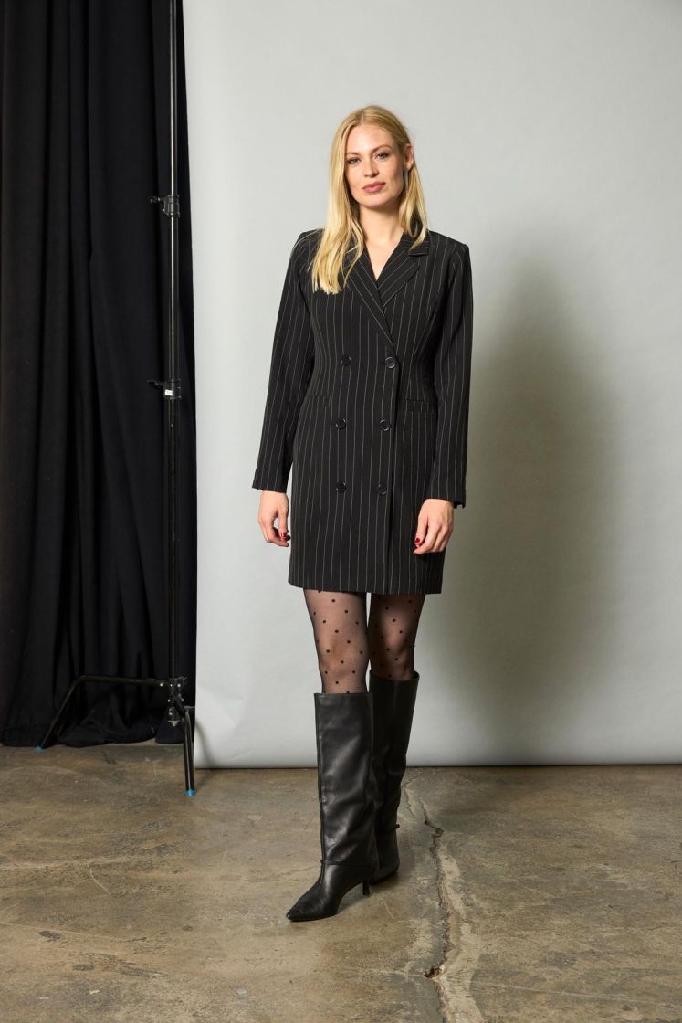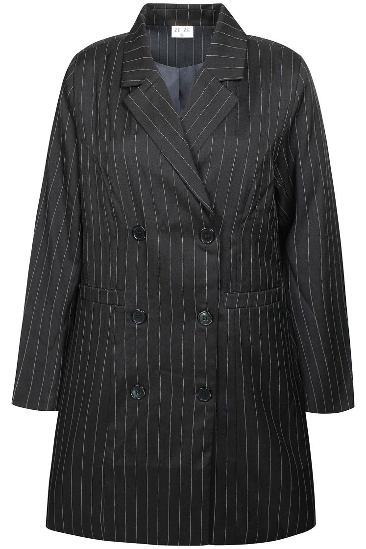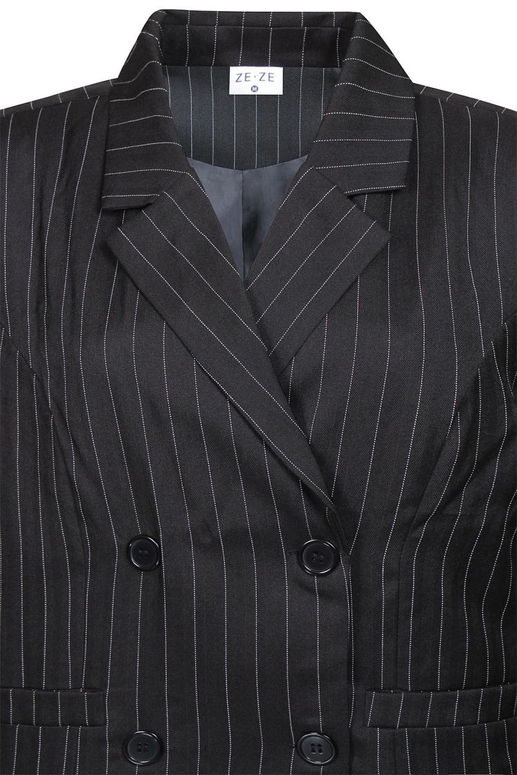 Ze-Ze makea liituraitainen jakkumekko. Mekko on linjakas ja siinä on tyylikäs kaksirivinen napitus. Olkatoppaukset antaa mukavasti ryhtiä ja edestä löytyy taskut. Materiaali on ohutta ja vuori miellyttävän liukas. Tarkistathan mitat.