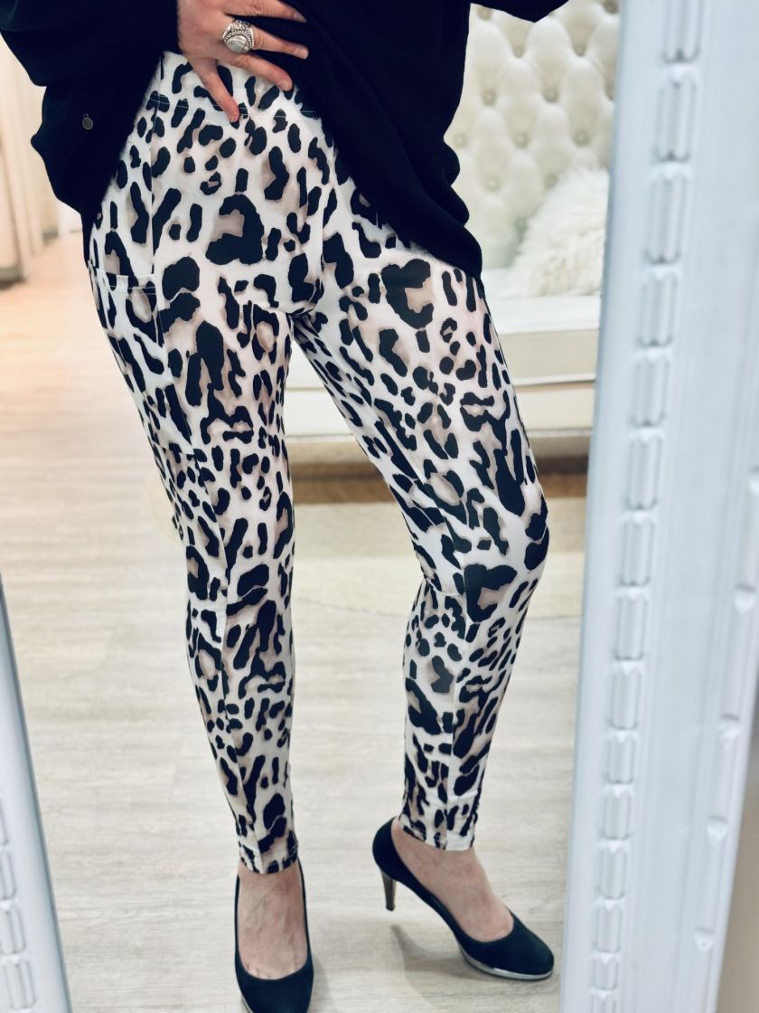 ZE-ZE leggingsit makealla leokuosilla. Sivuilla ilmettä antaa kätevät paikkataskut. Materiaali on ihanan ohutta, liukaspintaista ja joustavaa. Miellyttävä kuminauhavyötärö takaa mukavuuden. Mitoitus on normaali,