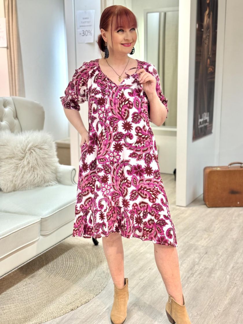 Mitä ihanin materiaali päällä. Ze-Ze mekko kauniilla paisley kuviolla. Materiaali laskeutuvaa viskoosikreppiä. Sivuilla taskut ja pääntiellä solmittavat nauhat. Vajaamittainen hiha joustonauhalla tuo kivan kevyen ilmeen. Helmassa hulmuava frilla ja malli on suora.